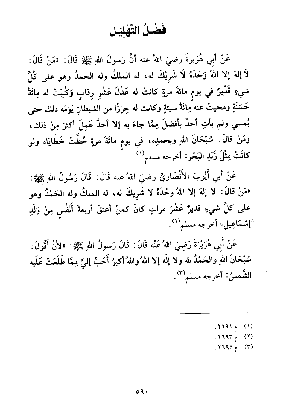 عن أبي هريرة رضي الله عنه أن رسول الله صلى الله عليه وسلم قال:" من قال: لا إله إلا الله وحده لا شريك له، له الملك وله الحمد وهو على كل شيء قدير في يوم مائة مرة كانت له عدل عشر رقاب وكتبت له مائة حسنة ومحيت عنه مائة سيئة وكانت له حرزاً من الشيطان يومه ذلك حتى يمسي ولم يأت أحد بأفضل مما جاء به إلا أحد عمل أكثر من ذلك، ومن قال: سبحان الله وبحمده، في يوم مائة مرة حطت خطاياه ولو كانت مثل زبد البحر"أخرجه مسلم (¬1).