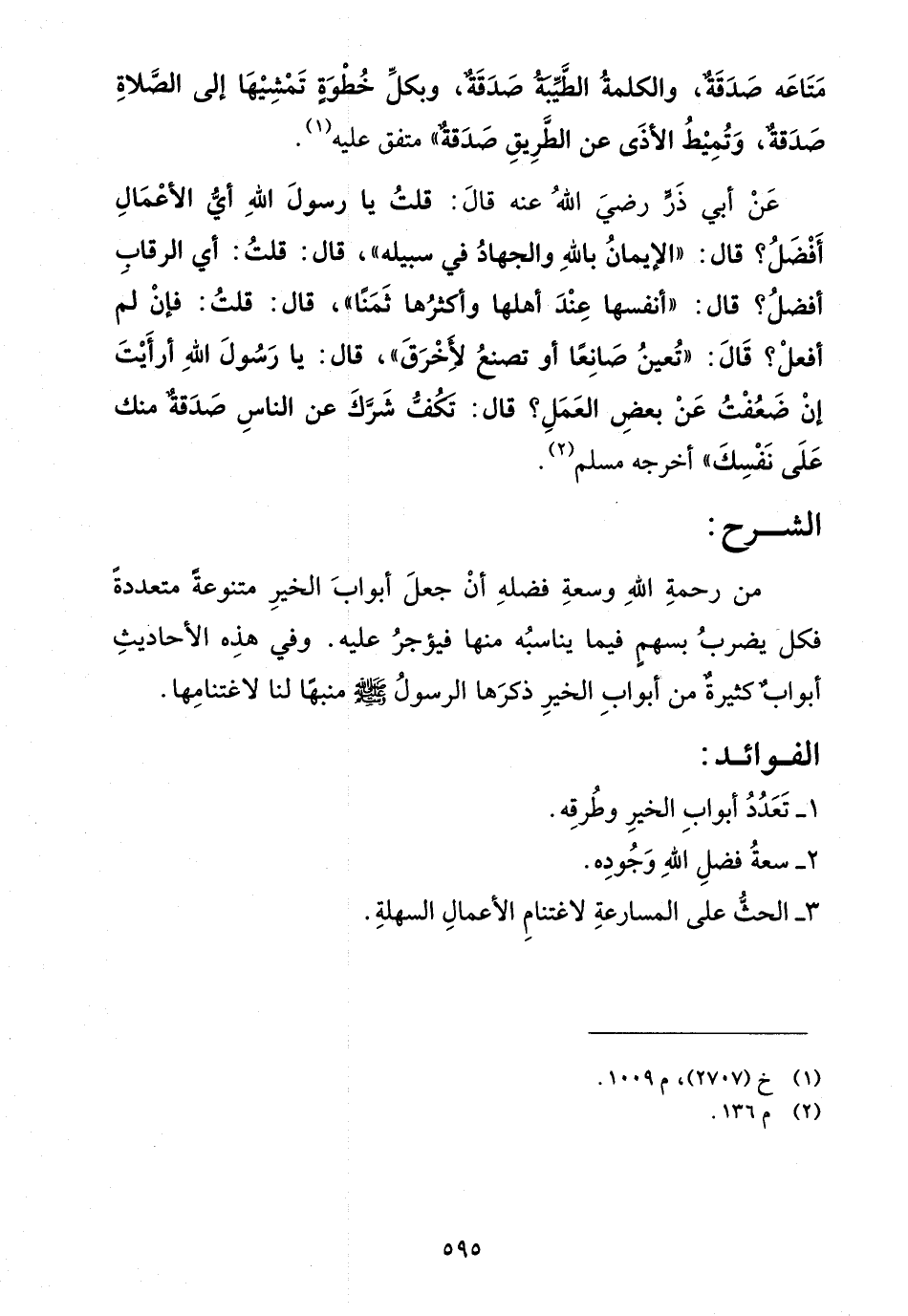 عن أبي ذر رضي الله عنه قال: قلت يا رسول الله أي الأعمال أفضل؟ قال: "الإيمان بالله والجهاد في سبيله"، قال: قلت: أي الرقاب أفضل؟ قال: "أنفسها عند أهلها وأكثرها ثمناً"، قال: قلت: فإن لم أفعل؟ قال: "تعين صانعاً أو تصنع لأخرق"، قال: يا رسول الله أرأيت إن ضعفت عن بعض العمل؟ قال: تكف شرك عن الناس صدقة منك على نفسك"أخرجه مسلم (¬2).