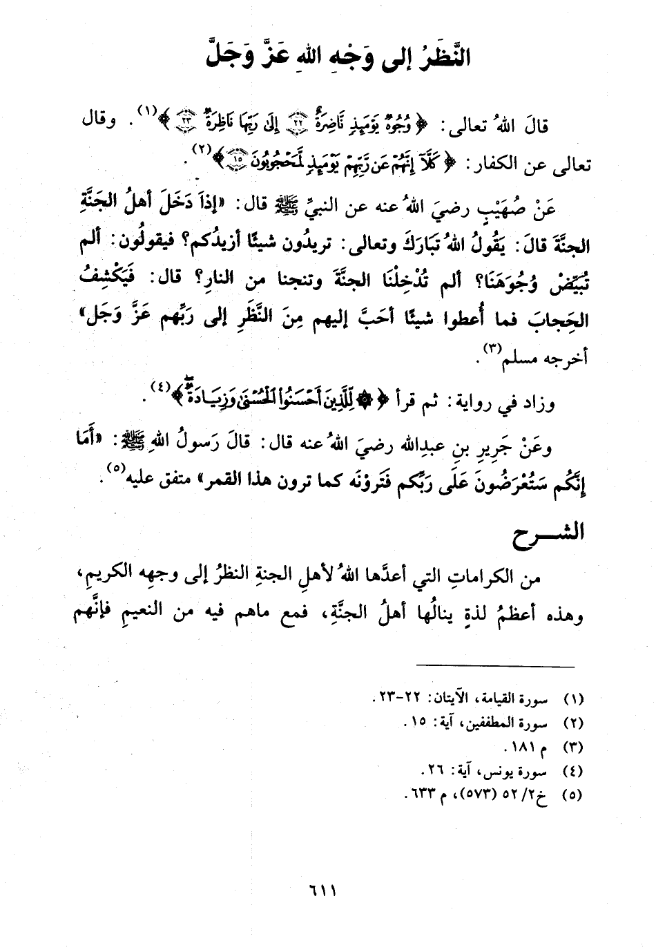 وعن جرير بن عبد الله رضي الله عنه قال: قال رسول الله صلى الله عليه وسلم: "أما إنكم ستعرضون على ربكم فترونه كما ترون هذا القمر" متفق عليه (¬5).