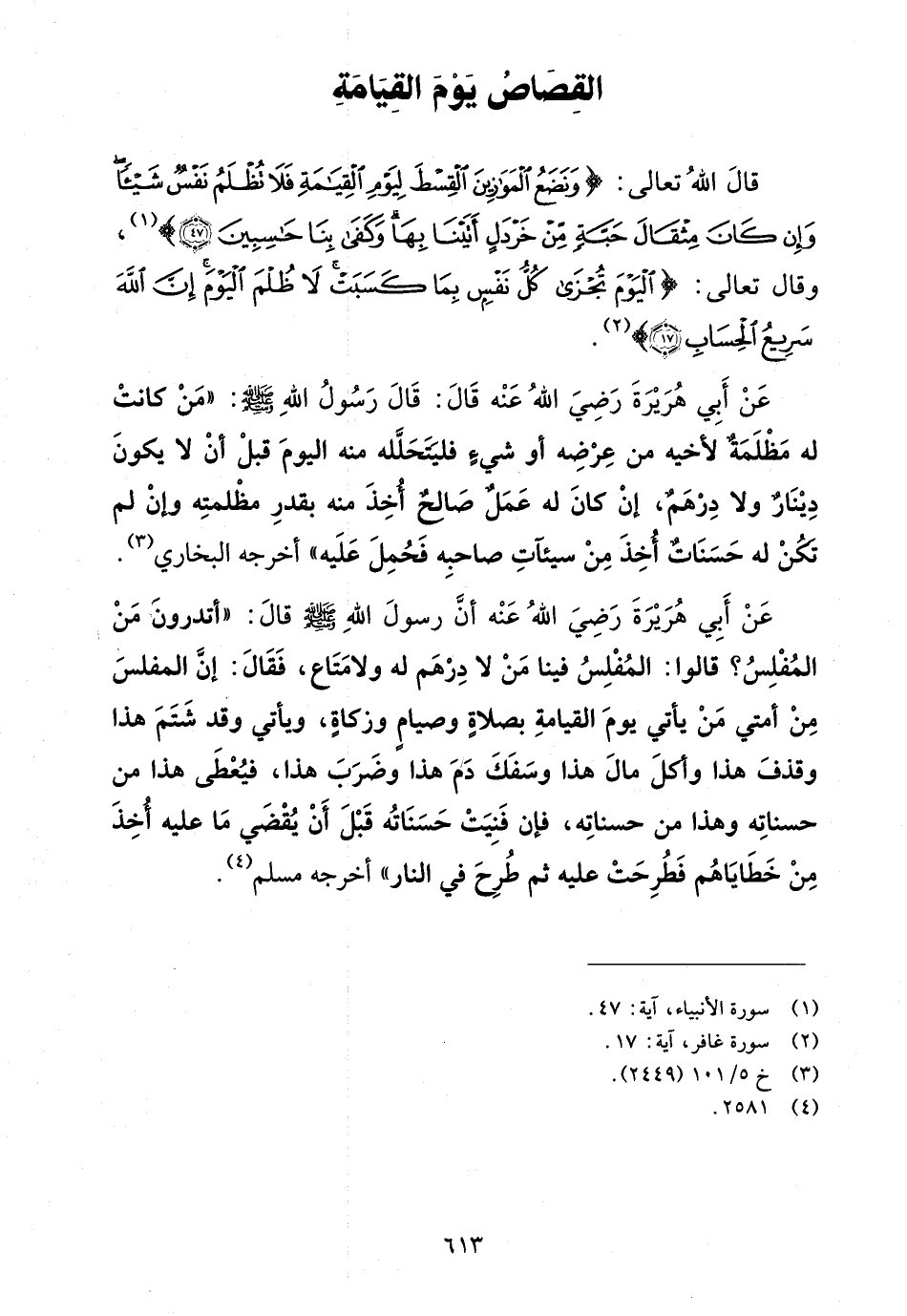 عن أبي هريرة رضي الله عنه قال: قال رسول الله صلى الله عليه وسلم:" من كانت له مظلمة لأخيه من عرضه أو شيء فليتحلله منه اليوم قبل أن لا يكون دينار ولا درهم، إن كان له عمل صالح أخذ منه بقدر مظلمته وإن لم تكن له حسنات أخذ من سيئآت صاحبه فحمل عليه"أخرجه البخاري (¬3).