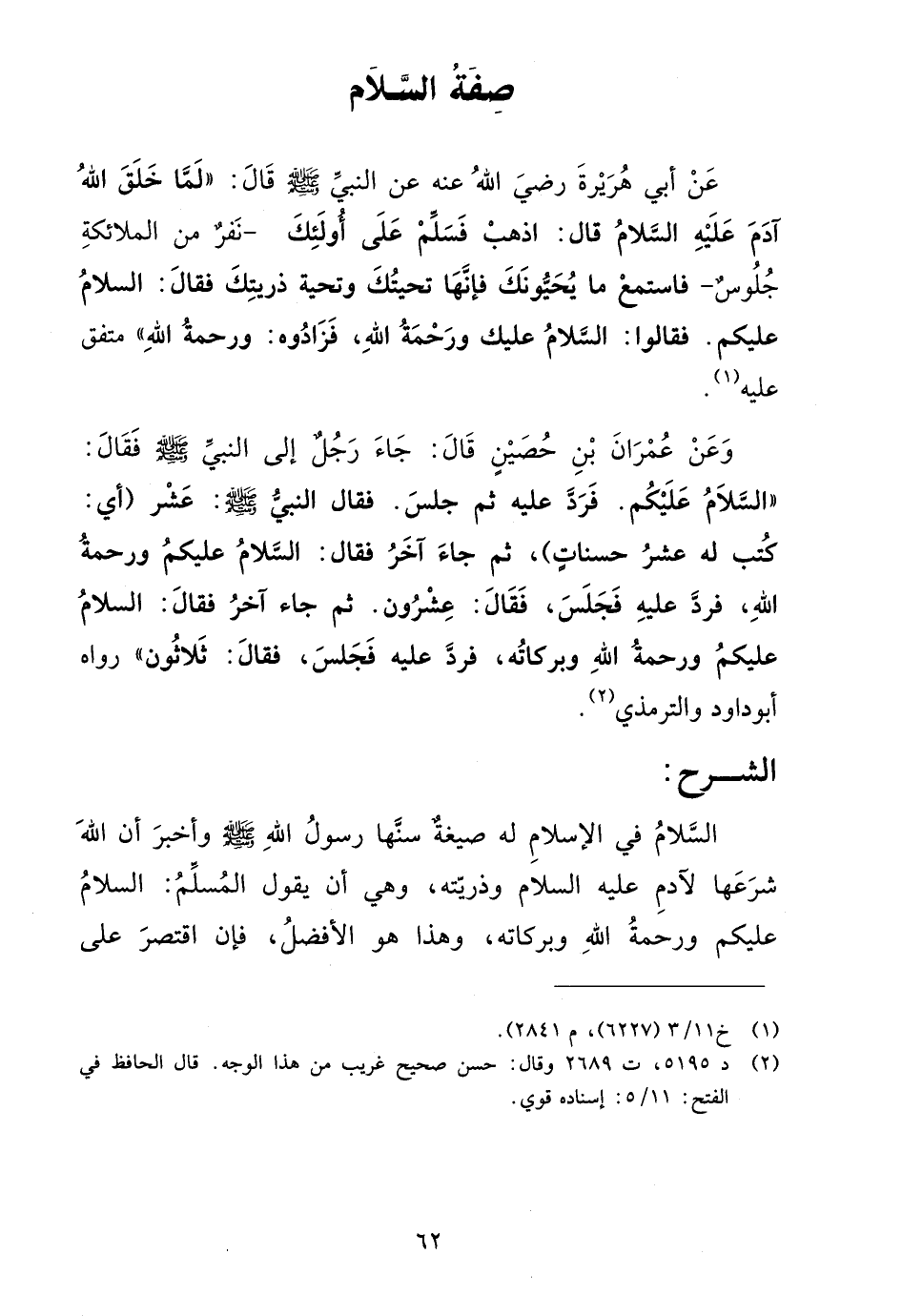 وعن عمران بن حصين قال: جاء رجل إلى النبي صلى الله عليه وسلم فقال: السلام عليكم. فرد عليه ثم جلس. فقال النبي صلى الله عليه وسلم: عشر (أي: كتب له عشر حسنات)، ثم جاء آخر فقال: السلام عليكم ورحمة الله، فرد عليه فجلس، فقال: عشرون. ثم جاء آخر فقال: السلام عليكم ورحمة الله وبركاته، فرد عليه فجلس، فقال: ثلاثون" رواه أبو داود والترمذي (¬2).