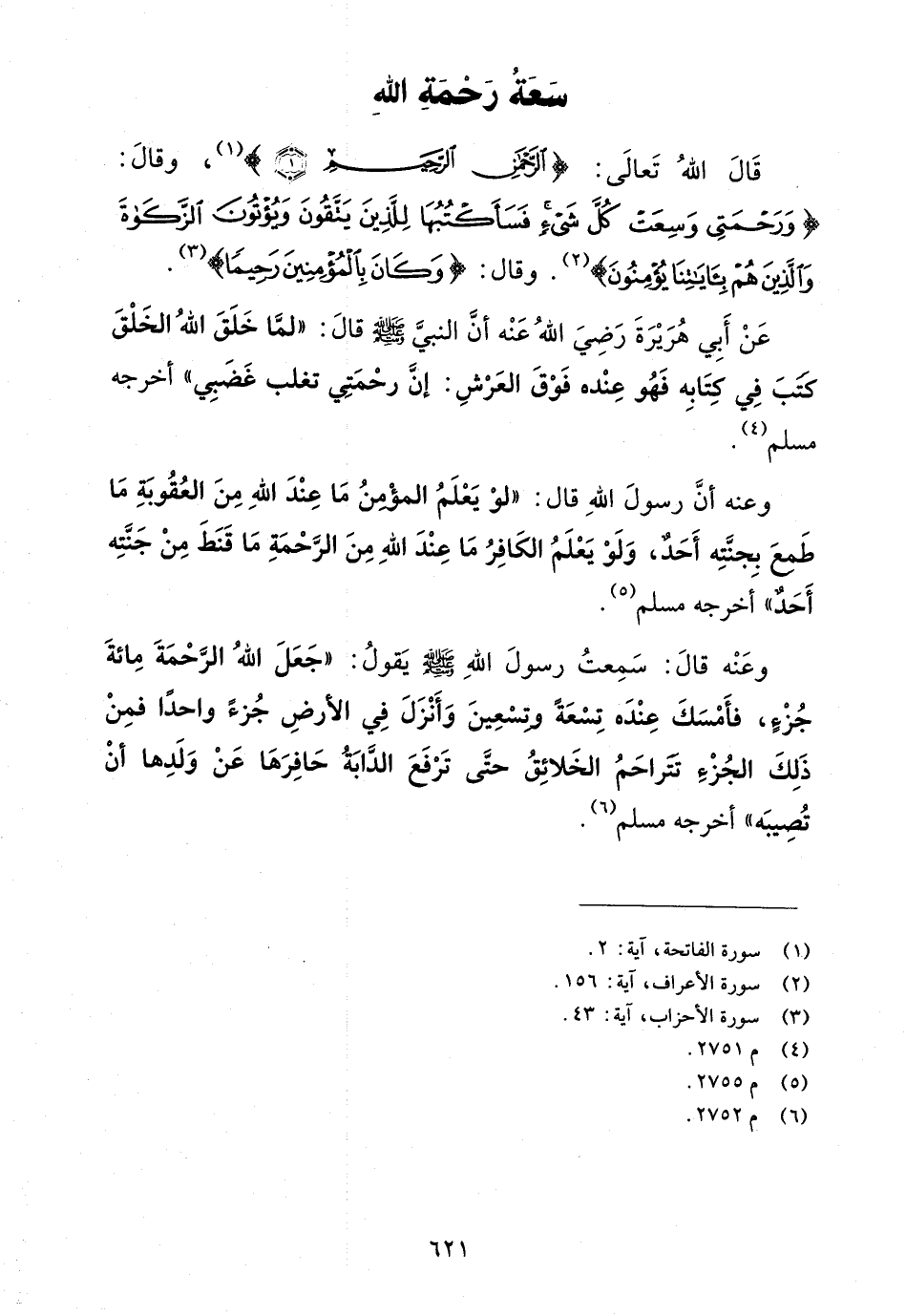 قال الله تعالى: {الرَّحْمَنِ الرَّحِيمِ} (¬1)، وقال {وَرَحْمَتِي وَسِعَتْ كُلَّ شَيْءٍ فَسَأَكْتُبُهَا لِلَّذِينَ يَتَّقُونَ وَيُؤْتُونَ الزَّكَاةَ وَالَّذِينَ هُم بِآيَاتِنَا يُؤْمِنُونَ} (¬2). وقال {وَكَانَ بِالْمُؤْمِنِينَ رَحِيمًا} (¬3).