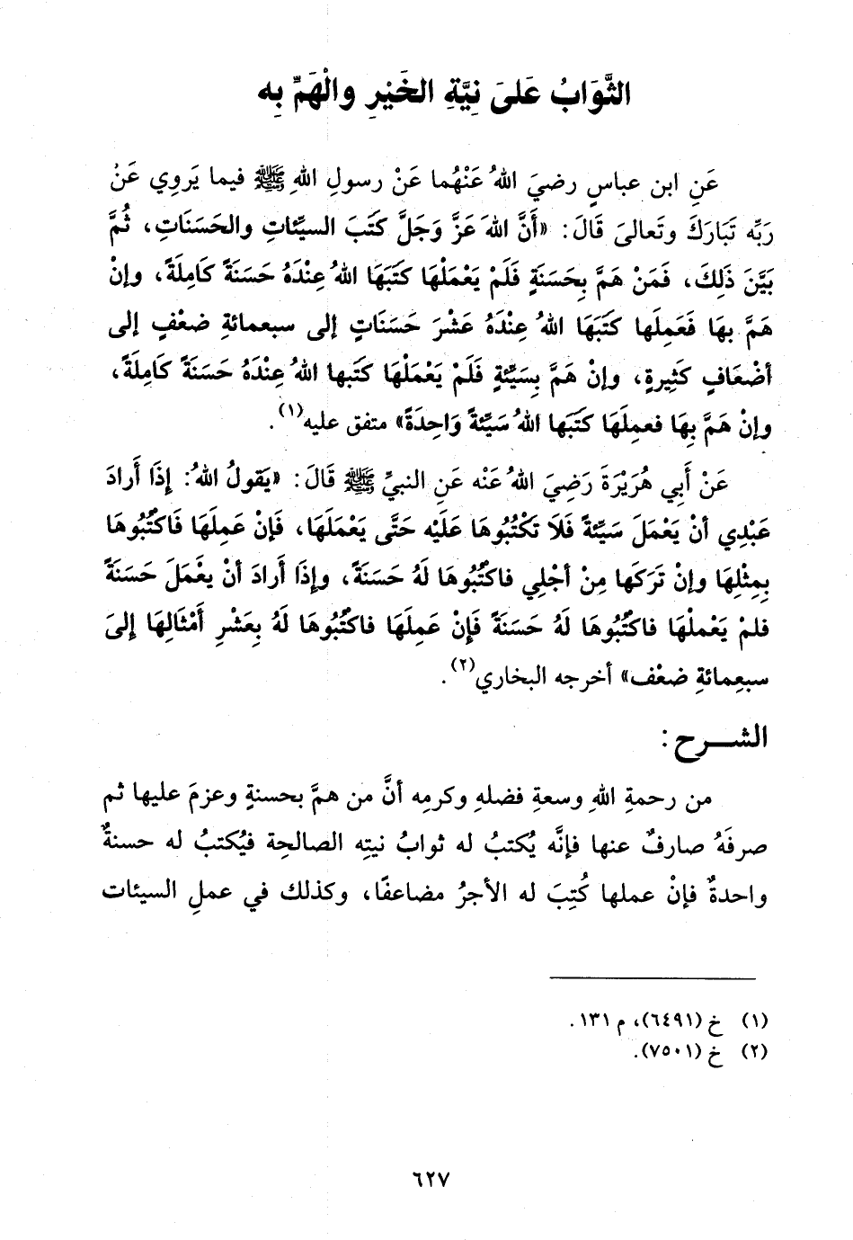 عن ابن عباس رضي الله عنهما عن رسول الله صلى الله عليه وسلم فيما يروي عن ربه تبارك وتعالى قال: "أن الله عز وجل كتب السيئات والحسنات، ثم بين ذلك، فمن هم بحسنة فلم يعملها كتبها الله عنده حسنة كاملة، وإن هم بها فعملها كتبها الله عنده عشر حسنات إلى سبعمائة ضعف إلى أضعاف كثيرة، وإن هم بسيئة فلم يعملها كتبها الله عنده حسنة كاملة، وإن هم بها فعملها كتبها الله سيئة واحدة"متفق عليه (¬1).