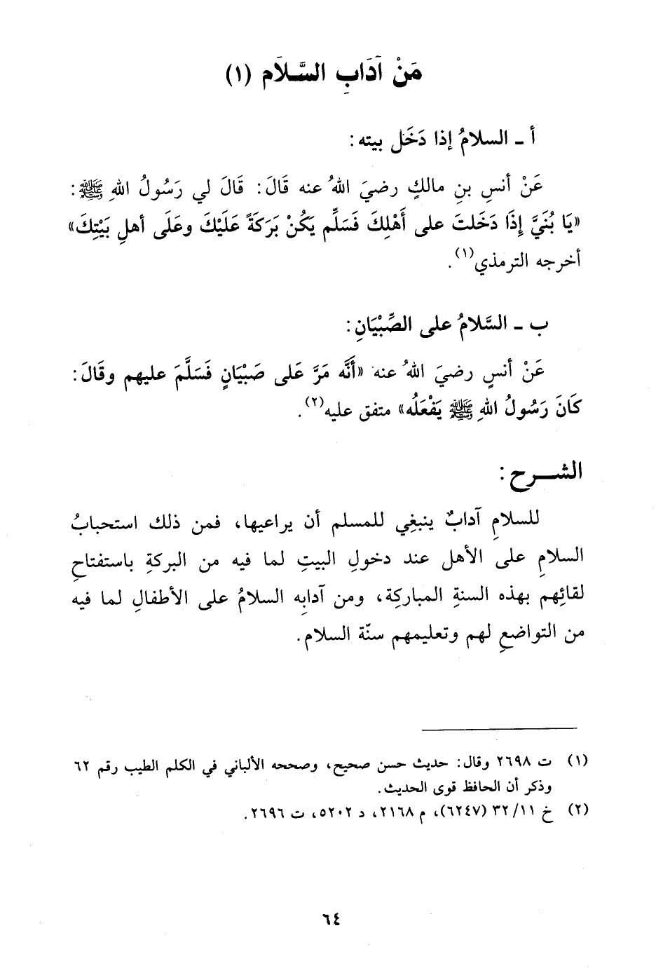 عن أنس بن مالك رضي الله عنه قال: قال لي رسول الله صلى الله عليه وسلم: "يا بني إذا دخلت على أهلك فسلم يكن بركة عليك وعلى أهل بيتك" أخرجه الترمذي (¬1).