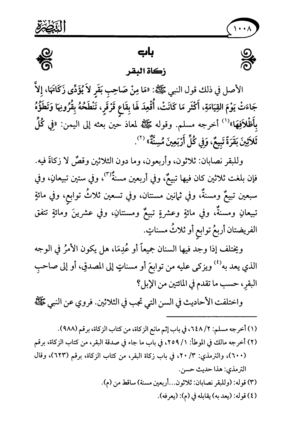(¬2) أخرجه مالك في الموطأ: 1/ 259، في باب ما جاء في صدقة البقر، من كتاب الزكاة، برقم (600)، والترمذي: 3/ 20، في باب زكاة البقر، من كتاب الزكاة برقم (623)، وقال الترمذي: هذا حديث حسن.