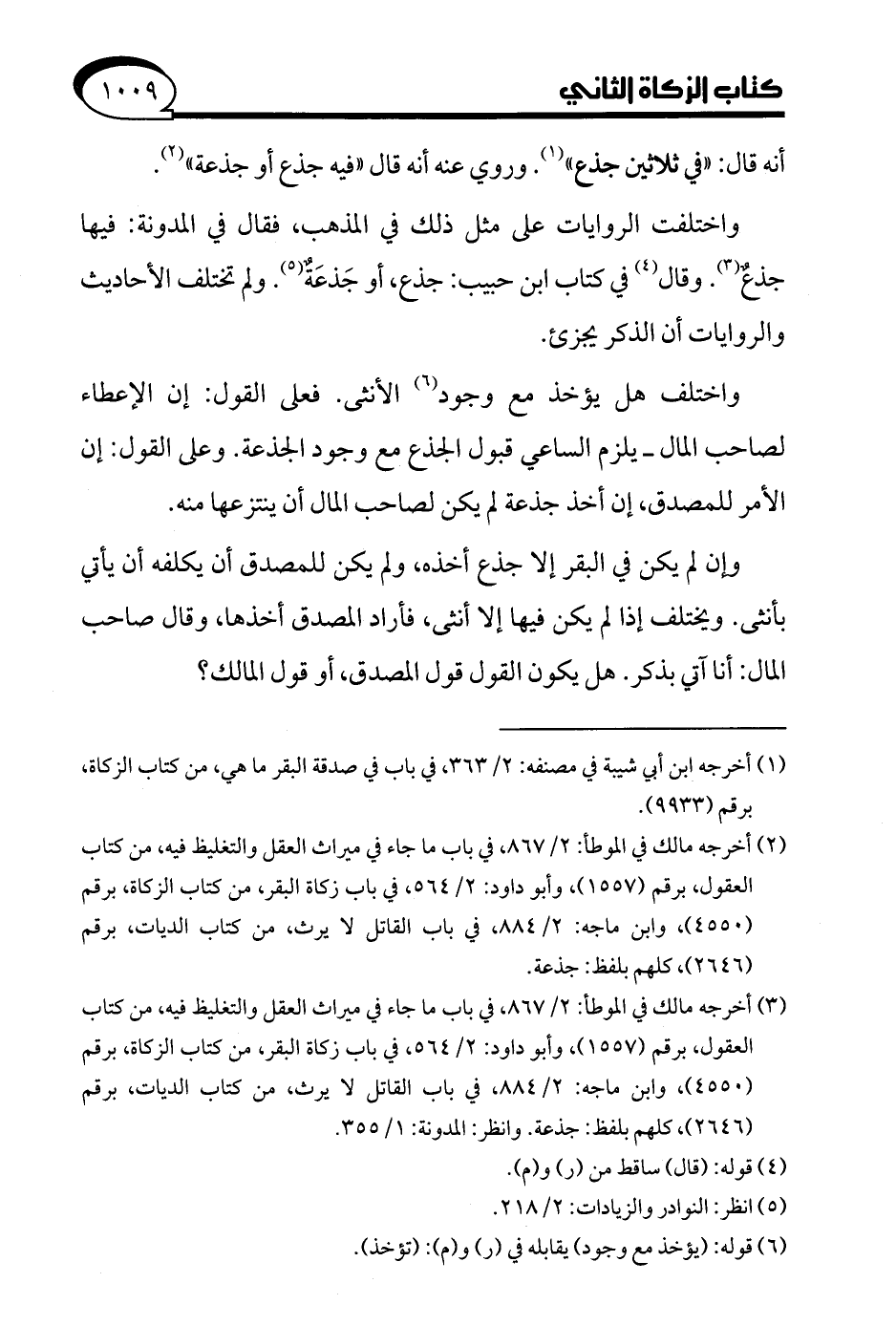 (¬3) أخرجه مالك في الموطأ: 2/ 867، في باب ما جاء في ميراث العقل والتغليظ فيه، من كتاب العقول، برقم (1557)، وأبو داود: 2/ 564، في باب زكاة البقر، من كتاب الزكاة برقم (4550)، وابن ماجه: 2/ 884، في باب القاتل لا يرث، من كتاب الديات، برقم (2646)، كلهم بلفظ: جذعة. وانظر: المدونة: 1/ 355.