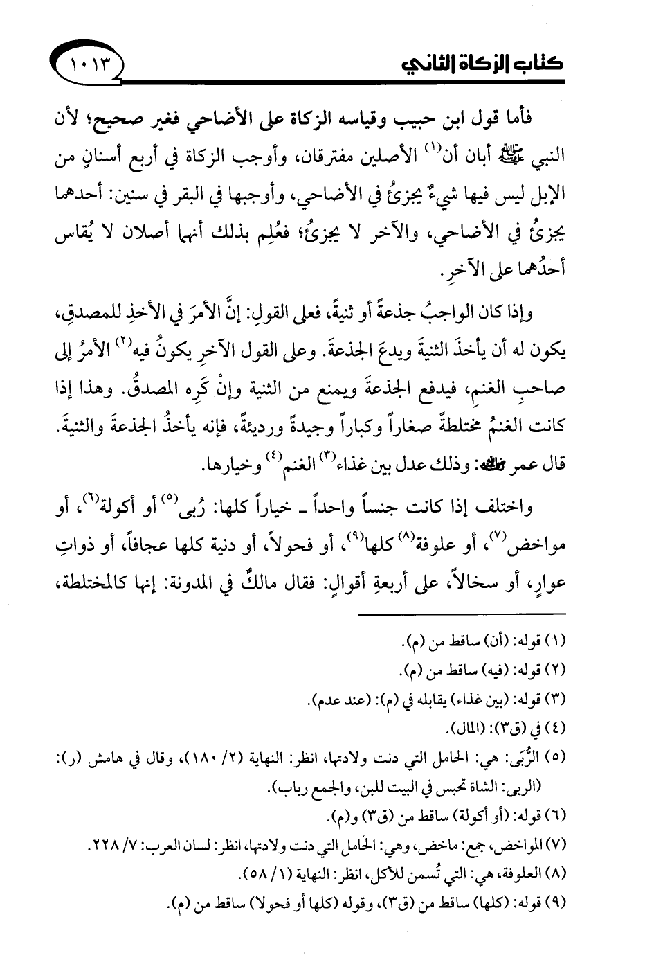 فأما قول ابن حبيب وقياسه الزكاة على الأضاحي فغير صحيح؛ لأن النبي - صلى الله عليه وسلم - أبان أن (¬1) الأصلين مفترقان، وأوجب الزكاة في أربع أسنانٍ من الإبل ليس فيها شيءُ يجزئُ في الأضاحي، وأوجبها في البقر في سنين: أحدهما يجزئُ في الأضاحي، والآخر لا يجزئُ؛ فعُلِم بذلك أنهما أصلان لا يُقاس أحدُهما على الآخرِ.