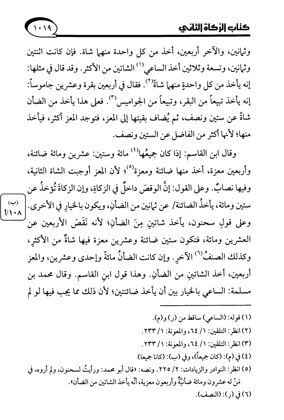 (¬5) انظر: النوادر والزيادات: 2/ 225. ونصه: "قال أبو محمد: ورأيتُ لسحنون، ولم أروه في مَنْ له عشرون ومائة ضأنيَّةٌ وأربعون معزية، أنَّه يأخذ الشاتين من الضأن".
