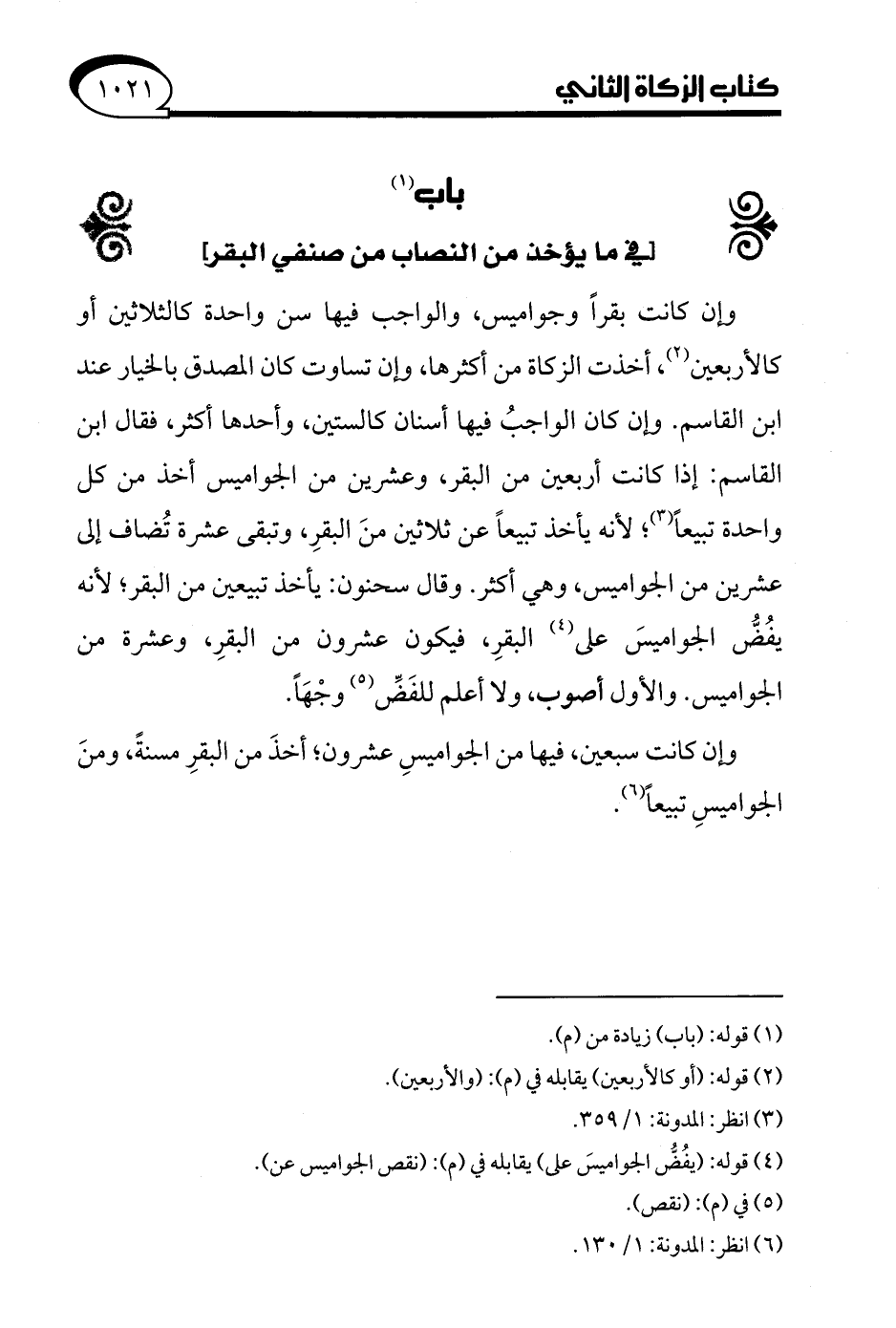 وإن كانت بقرًا وجواميس، والواجب فيها سن واحدة كالثلاثين أو كالأربعين (¬2)، أخذت الزكاة من أكثرها، وإن تساوت كان المصدق بالخيار عند ابن القاسم. وإن كان الواجبُ فيها أسنان كالستين، وأحدها أكثر، فقال ابن القاسم: إذا كانت أربعين من البقر، وعشرين من الجواميس أخذ من كل واحدة تبيعًا (¬3)؛ لأنه يأخذ تبيعًا عن ثلاثين منَ البقرِ، وتبقى عشرة تُضاف إلى عشرين من الجواميس، وهي أكثر. وقال سحنون: يأخذ تبيعين من البقر؛ لأنه يفُضُّ الجواميسَ على (¬4) البقرِ، فيكون عشرون من البقرِ، وعشرة من الجواميس. والأول أصوب، ولا أعلم للفَضِّ (¬5) وجْهًا.