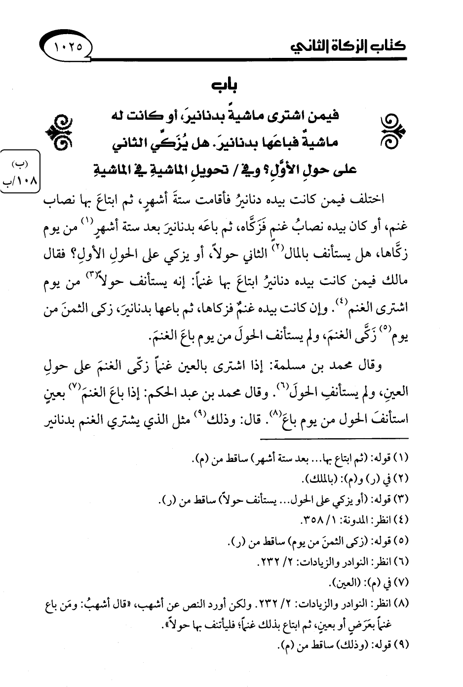 (¬8) انظر: النوادر والزيادات: 2/ 232. ولكن أورد النص عن أشهب، "قال أشهبُ: ومَن باع غنمًا بعَرَضٍ أو بعينٍ، ثم ابتاع بذلك غنمًا؛ فليأتنف بها حولًا".