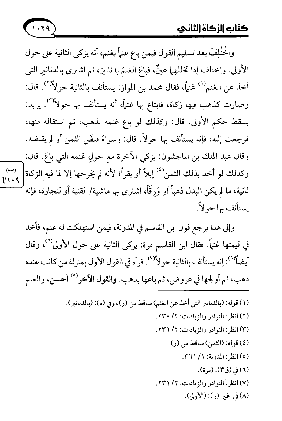 واخْتُلِفَ بعد تسليم القول فيمن باع غنمًا بغنم، أنه يزكي الثانية على حول الأولى. واختلف إذا تخللهما عينٌ، فباعَ الغنمَ بدنانيرَ، ثم اشترى بالدنانيرِ التي أخذ عن الغنم (¬1) غنمًا، فقال محمد بن المواز: يستأنف بالثانية حولًا (¬2). قال: وصارت كذهب فيها زكاة، فابتاع بها غنمًا، أنه يستأنف بها حولًا (¬3). يريد: يسقط حكم الأولى. قال: وكذلك لو باع غنمه بذهب، ثم استقاله منها، فرجعت إليه، فإنه يستأنف بها حولًا. قال: وسواءٌ قبضَ الثمنَ أو لم يقبضه. وقال عبد الملك بن الماجشون: يزكي الآخرة مع حولِ غنمه التي باعَ. قال: وكذلك لو أخذ بذلك الثمن (¬4) إبلًا أو بقرًا؛ لأنه لم يخرجها إلا لما فيه الزكاة ثانية، ما لم يكن البدل ذهبًا أو وَرِقًا، اشترى بها ماشية لقنية أو لتجارة، فإنه يستأنف بها حولًا.