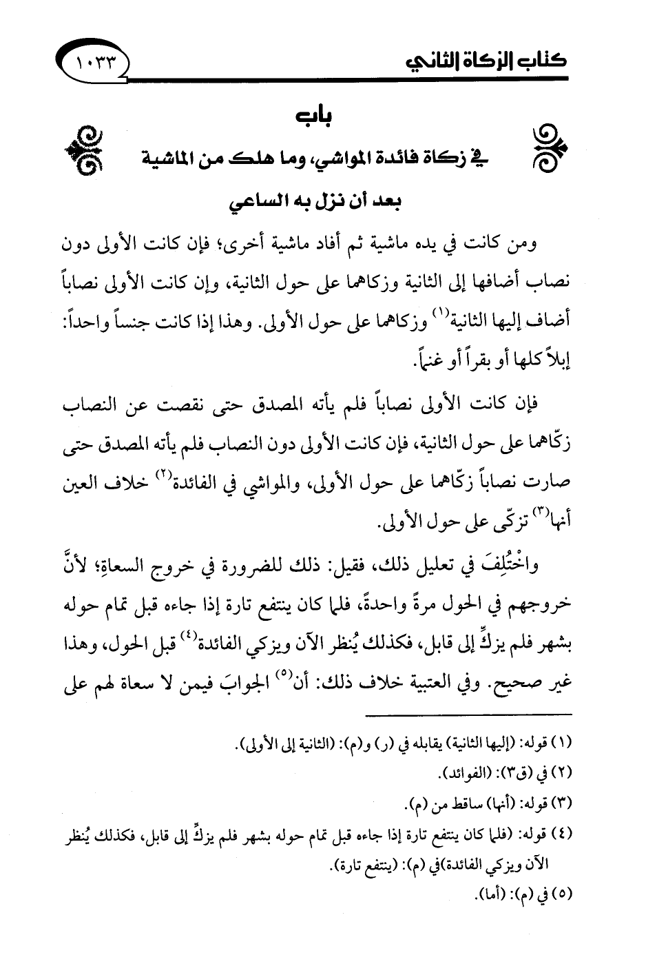فإن كانت الأولى نصابًا فلم يأته المصدق حتى نقصت عن النصاب زكّاهما على حول الثانية، فإن كانت الأولى دون النصاب فلم يأته الصدق حتى صارت نصابًا زكّاهما على حول الأولى، والمواشي في الفائدة (¬2) خلاف العين أنها (¬3) تزكّى على حول الأولى.