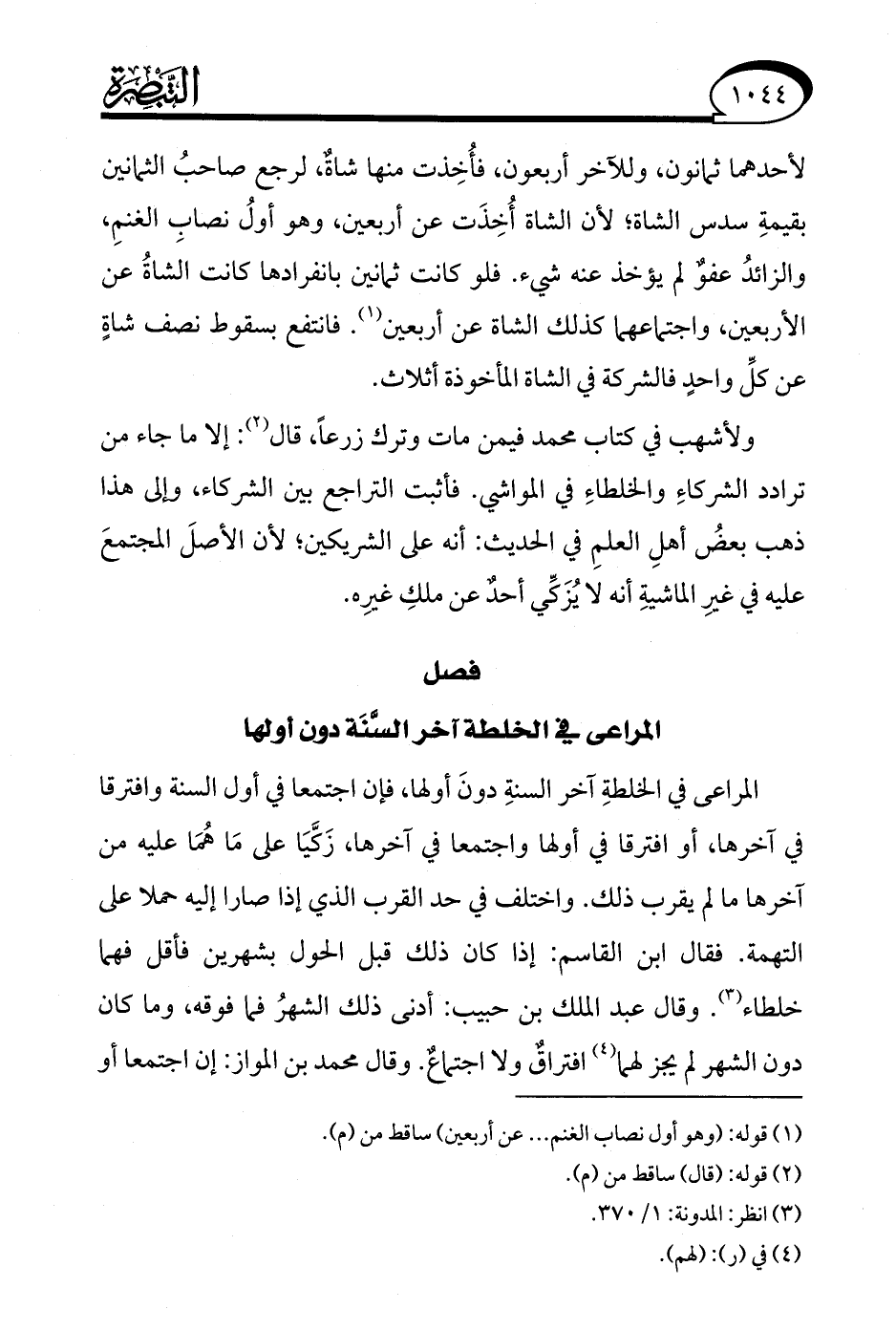 المراعى في الخلطةِ آخر السنةِ دونَ أولها، فإن اجتمعا في أول السنة وافترقا في آخرها، أو افترقا في أولها واجتمعا في آخرها، زَكَّيَا على مَا هُمَا عليه من آخرها ما لم يقرب ذلك. واختلف في حد القرب الذي إذا صارا إليه حملا على التهمة. فقال ابن القاسم: إذا كان ذلك قبل الحول بشهرين فأقل فهما خلطاء (¬3). وقال عبد الملك بن حبيب: أدنى ذلك الشهرُ فما فوقه، وما كان دون الشهر لم يجز لهما (¬4) افتراقٌ ولا اجتماعٌ. وقال محمد بن المواز: إن اجتمعا أو