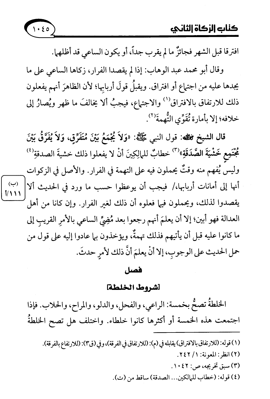قال الشيخ - رضي الله عنه -: قول النبي - صلى الله عليه وسلم -: "وَلاَ يُجْمَعُ بَيْنَ مُتَفَرِّقٍ، وَلاَ يُفَرَّقُ بَيْنَ مُجْتَمِعٍ خَشْيَةَ الصَّدَقَةِ" (¬3) خطابٌ للمالِكِينَ أنْ لا يفعلوا ذلك خشيةَ الصدقةِ (¬4) وليس يُفهم منه وقتٌ يحملون فيه على التهمة في الفرار. والأصل في الزكوات أنها إلى أمانات أربابها، فيجب أن يوعظوا حسب ما ورد في الحديث ألا يقصدوا لذلك، ويحملون فيما فعلوه أن ذلك لغير الفرار. وإن كانا من أهل العدالة فهو أبين، إلا أن يعلمَ أنهم رجعوا بعد مُضِيِّ الساعي بالأمرِ القريبِ إلى ما كانوا عليه قبل أن يأتيهم فذلك تهمةٌ، ويؤخذون بما عادوا إليه على قول من حمل الحديث على الوجوبِ، إلا أنْ يعلمَ أنَّ ذلك لأمرٍ حدثَ.