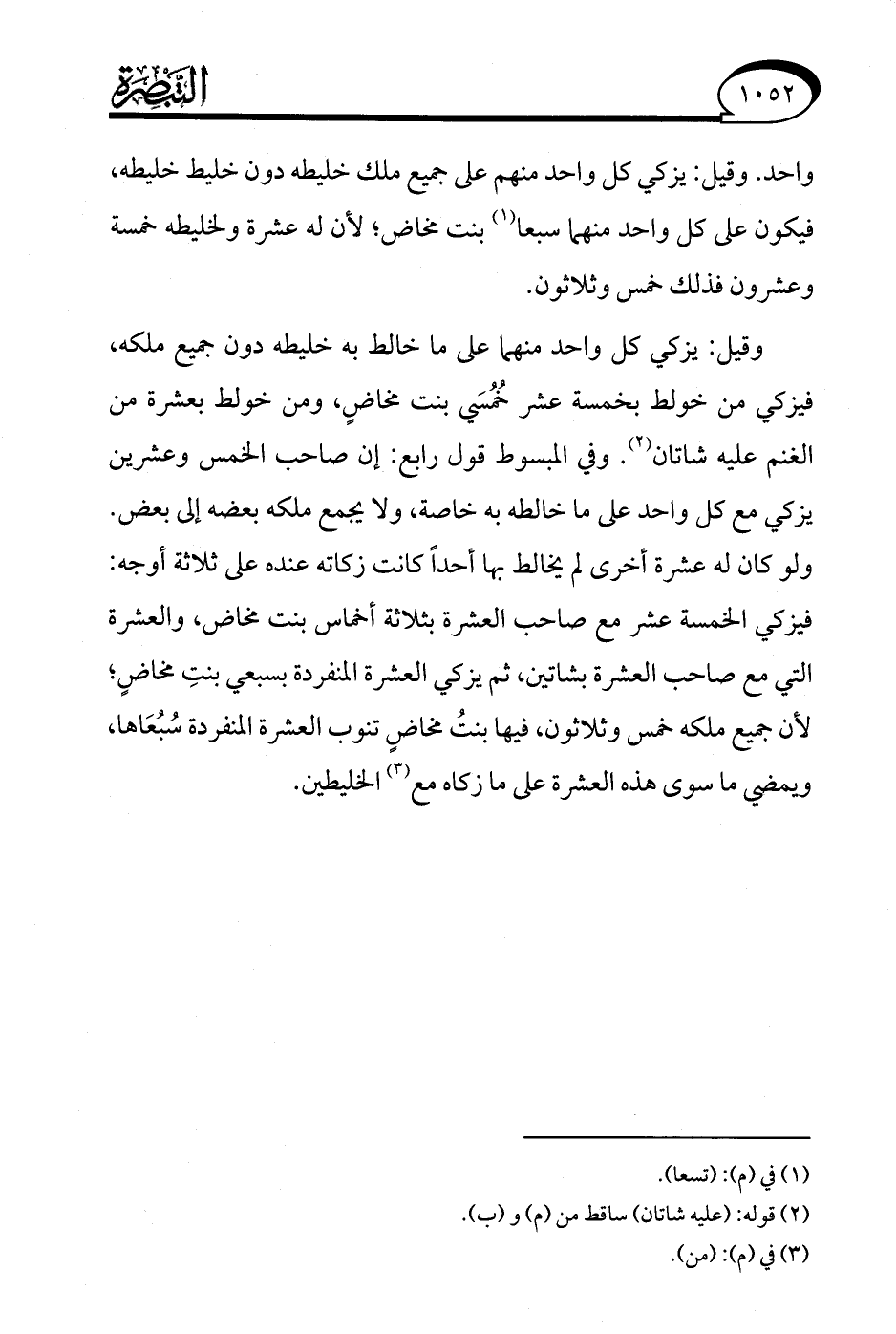 وقيل: يزكي كل واحد منهما على ما خالط به خليطه دون جميع ملكه، فيزكي من خولط بخمسة عشر خُمُسَي بنت مخاضٍ، ومن خولط بعشرة من الغنم عليه شاتان (¬2). وفي المبسوط قول رابع: إن صاحب الخمس وعشرين يزكي مع كل واحد على ما خالطه به خاصة، ولا يجمع ملكه بعضه إلى بعض. ولو كان له عشرة أخرى لم يخالط بها أحدًا كانت زكاته عنده على ثلاثة أوجه: فيزكي الخمسة عشر مع صاحب العشرة بثلاثة أخماس بنت مخاض، والعشرة التي مع صاحب العشرة بشاتين، ثم يزكي العشرة المنفردة بسبعي بنتِ مخاضٍ؛ لأن جميع ملكه خمس وثلاثون، فيها بنتُ مخاضٍ تنوب العشرة المنفردة سُبُعَاها، ويمضي ما سوى هذه العشرة على ما زكاه مع (¬3) الخليطين.