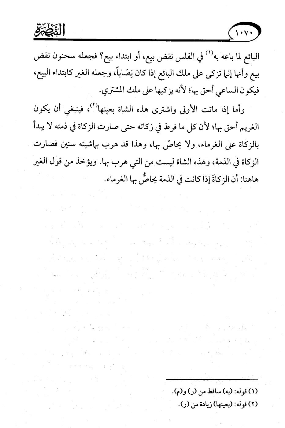 البائع لما باعه به (¬1) في الفلس نقض بيع، أو ابتداء بيع؟ فجعله سحنون نقض بيع وأنها إنما تزكى على ملك البائع إذا كان نِصَابًا، وجعله الغير كابتداء البيع، فيكون الساعي أحق بها؛ لأنه يزكيها على ملك المشتري.