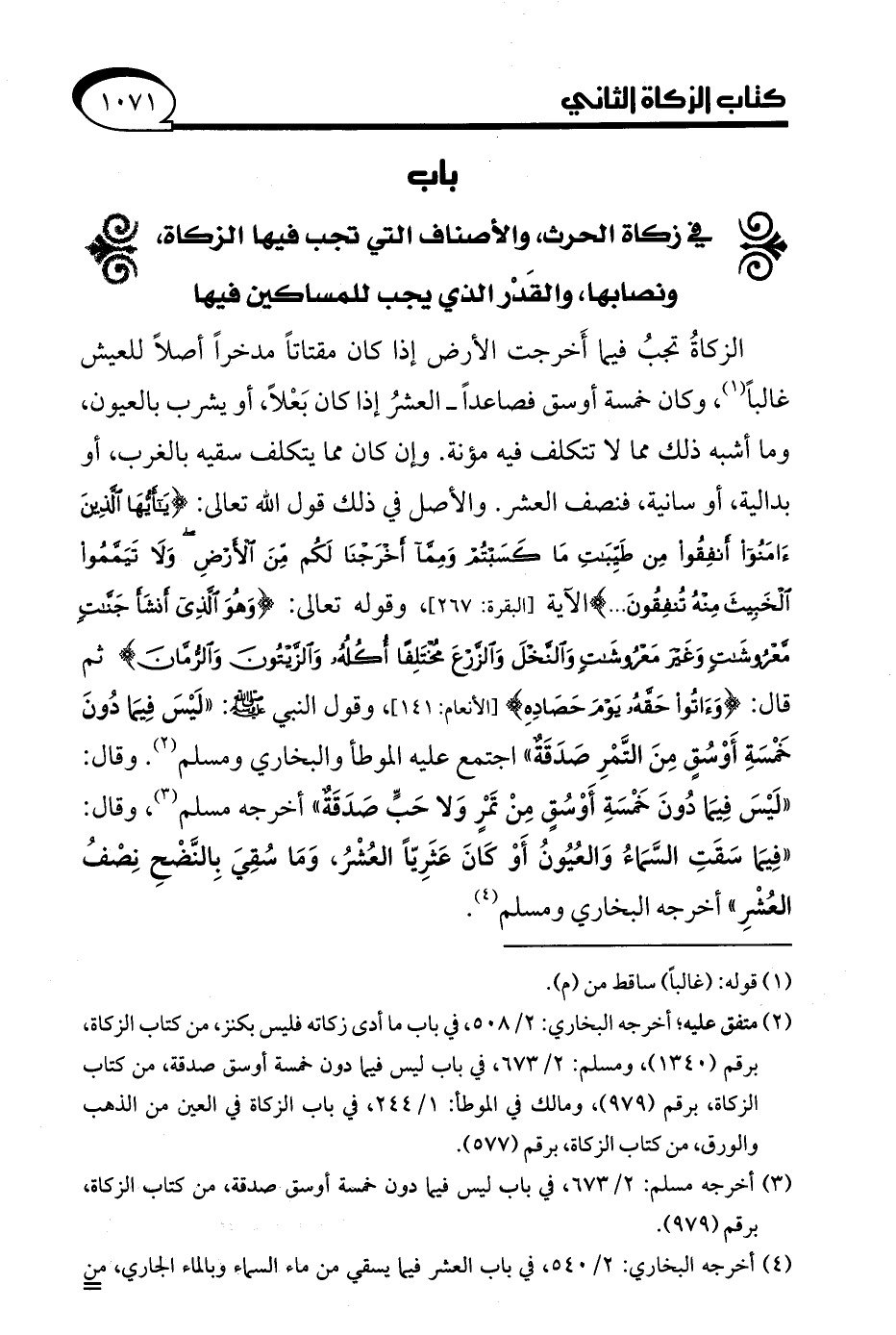 الزكاةُ تجبُ فيما أَخرجت الأرض إذا كان مقتاتًا مدخرًا أصلًا للعيش غالبًا (¬1)، وكان خمسة أوسق فصاعدًا- العشرُ إذا كان بَعْلًا، أو يشرب بالعيون، وما أشبه ذلك مما لا تتكلف فيه مؤنة. وإن كان مما يتكلف سقيه بالغرب، أو بدالية، أو سانية، فنصف العشر. والأصل في ذلك قول الله تعالى: {يَاأَيُّهَا الَّذِينَ آمَنُوا أَنْفِقُوا مِنْ طَيِّبَاتِ مَا كَسَبْتُمْ وَمِمَّا أَخْرَجْنَا لَكُمْ مِنَ الْأَرْضِ وَلَا تَيَمَّمُوا الْخَبِيثَ مِنْهُ تُنْفِقُونَ} الآية [البقرة: 267]، وقوله تعالى: {وَهُوَ الَّذِي أَنْشَأَ جَنَّاتٍ مَعْرُوشَاتٍ وَغَيْرَ مَعْرُوشَاتٍ وَالنَّخْلَ وَالزَّرْعَ مُخْتَلِفًا أُكُلُهُ وَالزَّيْتُونَ وَالرُّمَّانَ} ثم قال: {وَآتُوا حَقَّهُ يَوْمَ حَصَادِهِ} [الأنعام: 141]، وقول النبي - صلى الله عليه وسلم -: "لَيْسَ فِيمَا دُونَ خَمْسَةِ أَوْسُقٍ مِنَ التَّمْرِ صَدَقَةٌ" اجتمع عليه الموطأ والبخاري ومسلم (¬2). وقال: "لَيْسَ فِيمَا دُونَ خَمْسَةِ أَوْسُقٍ مِنْ تَمْرٍ وَلا حَبٍّ صَدَقَةٌ" أخرجه مسلم (¬3)، وقال: "فِيمَا سَقَتِ السَّمَاءُ وَالعُيُونُ أَوْ كَانَ عَثَرِيًّا العُشْرُ، وَمَا سُقِيَ بالنَّضْح نِصْفُ العُشْرِ" أخرجه البخاري ومسلم (¬4).