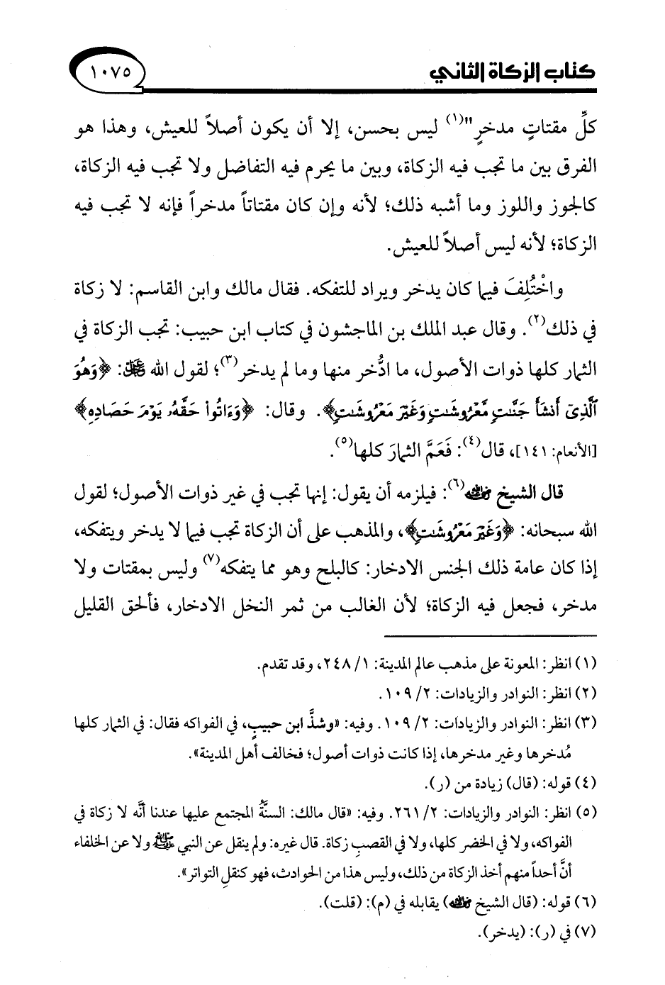 (¬3) انظر: النوادر والزيادات: 2/ 109. وفيه: "وشذَّ ابن حبيبٍ، في الفواكه فقال: في الثمار كلها مُدخرها وغير مدخرها، إذا كانت ذوات أصول؛ فخالف أهل المدينة".