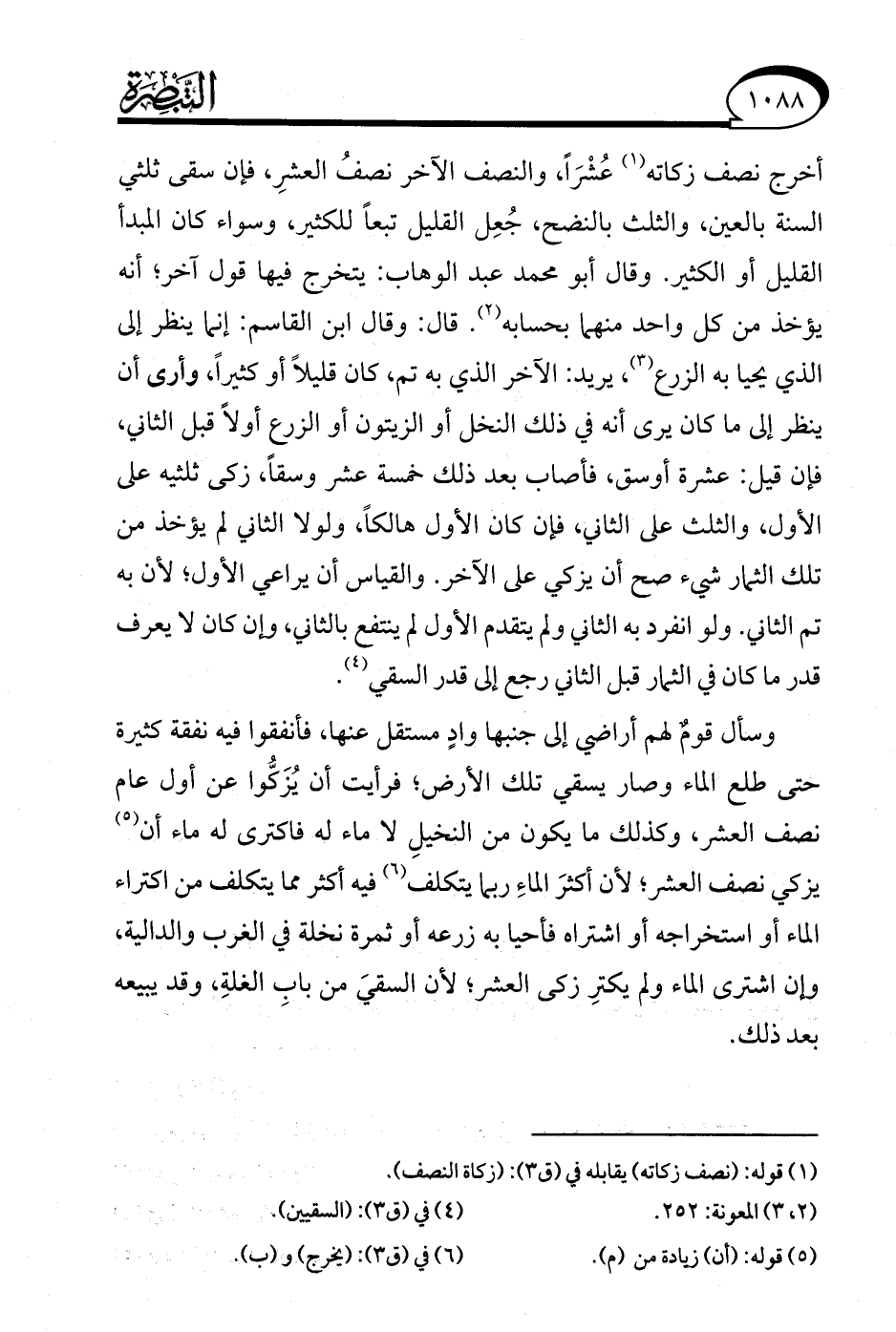 وسأل قومٌ لهم أراضي إلى جنبها وادٍ مستقل عنها، فأنفقوا فيه نفقة كثيرة حتى طلع الماء وصار يسقي تلك الأرض؛ فرأيت أن يُزَكُّوا عن أول عام نصف العشر، وكذلك ما يكون من النخيلِ لا ماء له فاكترى له ماء أن (¬5) يزكي نصف العشر؛ لأن أكثرَ الماءِ ربما يتكلف (¬6) فيه أكثر مما يتكلف من اكتراء الماء أو استخراجه أو اشتراه فأحيا به زرعه أو ثمرة نخلة في الغرب والدالية، وإن اشترى الماء ولم يكترِ زكى العشر؛ لأن السقيَ من بابِ الغلةِ، وقد يبيعه بعد ذلك.