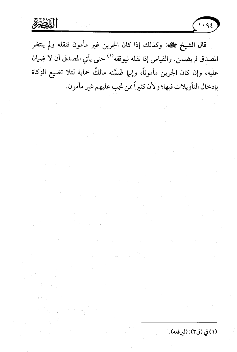 قال الشيخ - رضي الله عنه -: وكذلك إذا كان الجرين غير مأمون فنقله ولم ينتظر المصدق لم يضمن. والقياس إذا نقله ليوقفه (¬1) حتى يأتي المصدق أن لا ضمان عليه، وإن كان الجرين مأمونًا، وإنما ضَمَّنه مالكٌ حماية لئلا تضيع الزكاة بإدخال التأويلات فيها؛ ولأن كثيرًا ممن تجب عليهم غير مأمون.