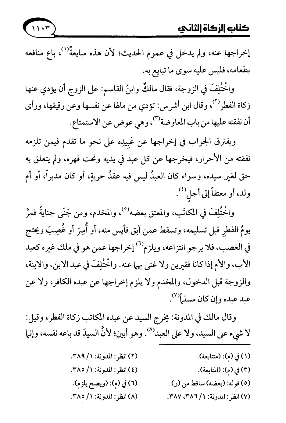 ويفترق الجواب في إخراجها عن عَبِيدِه على نحو ما تقدم فيمن تلزمه نفقته من الأحرار، فيخرجها عن كل عبد في يديه وتحت قهره، ولم يتعلق به حق لغير سيده، وسواء كان العبدُ ليس فيه عقدُ حريةٍ، أو كان مدبرًا، أو أم ولد، أو معتقًا إلى أجلٍ (¬4).
