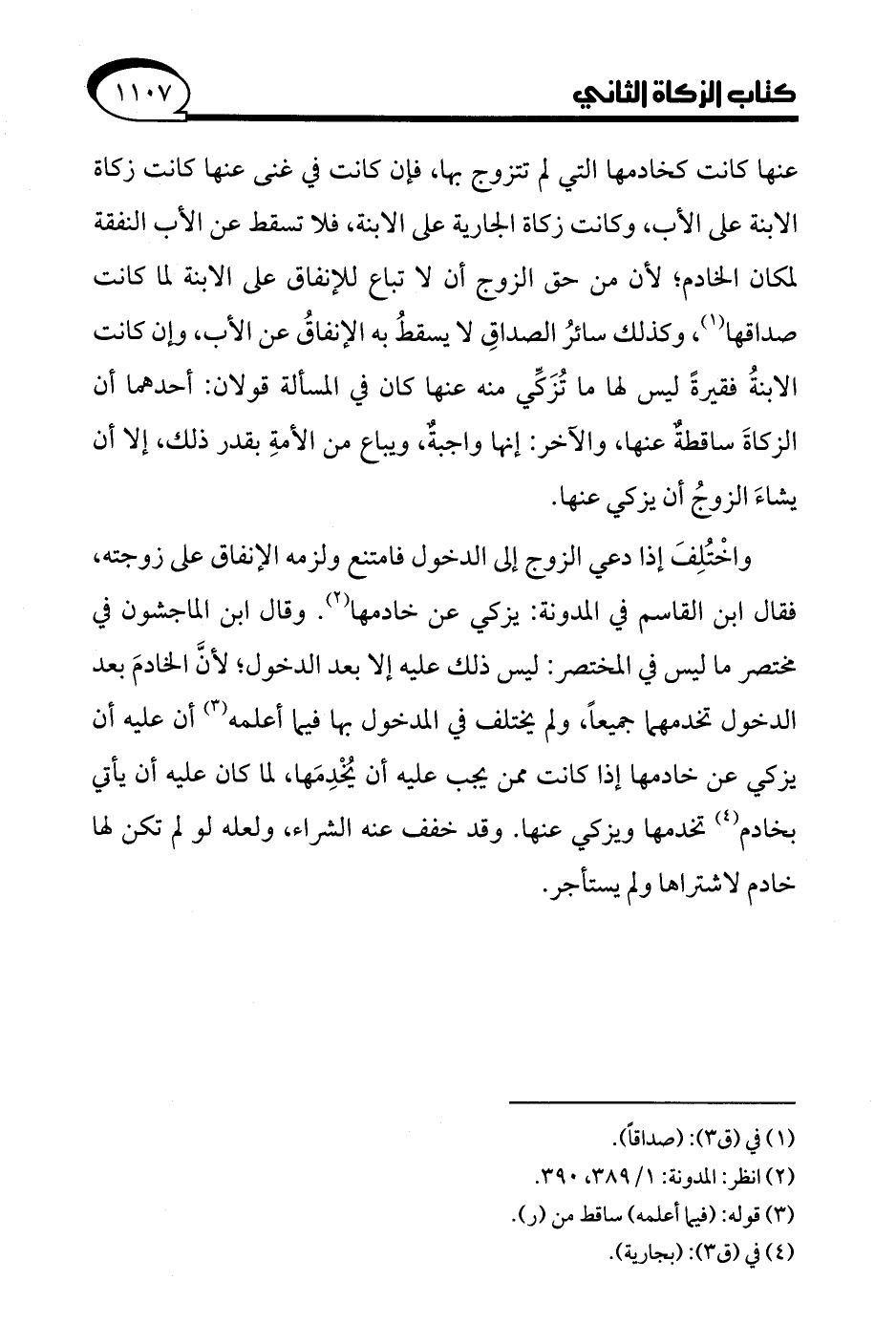 واخْتُلِفَ إذا دعي الزوج إلى الدخول فامتنع ولزمه الإنفاق على زوجته، فقال ابن القاسم في المدونة: يزكي عن خادمها (¬2). وقال ابن الماجشون في مختصر ما ليس في المختصر: ليس ذلك عليه إلا بعد الدخول؛ لأنَّ الخادمَ بعد الدخول تخدمهما جميعًا، ولم يختلف في المدخول ما فيما أعلمه (¬3) أن عليه أن يزكي عن خادمها إذا كانت ممن يجب عليه أن يُخْدِمَها، لما كان عليه أن يأتي بخادم (¬4) تخدمها ويزكي عنها. وقد خفف عنه الشراء، ولعله لو لم تكن لها خادم لاشتراها ولم يستأجر.