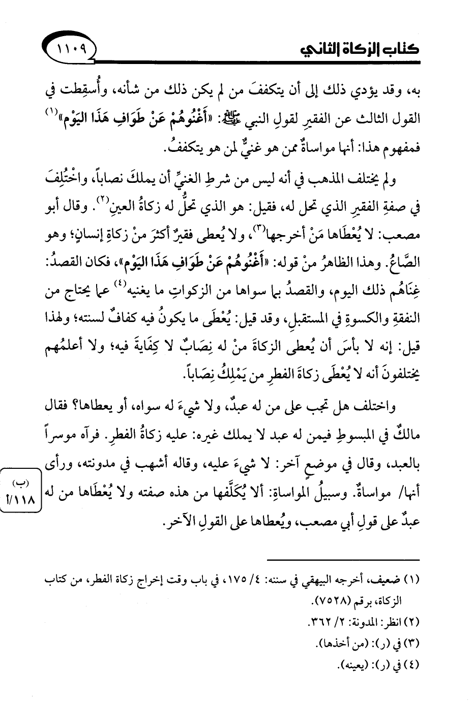 ولم يختلف المذهب في أنه ليس من شرطِ الغنيِّ أن يملكَ نصابًا، واخْتُلِفَ في صفةِ الفقيرِ الذي تحل له، فقيل: هو الذي تحلُّ له زكاةُ العينِ (¬2). وقال أبو مصعب: لا يُعْطَاها مَنْ أخرجها (¬3)، ولا يُعطى فقيرٌ أكثرَ منْ زكاةِ إنسانٍ؛ وهو الصَّاعُ. وهذا الظاهرُ منْ قوله: "أَغْنُوهُمْ عَنْ طَوَافِ هَذَا اليَوْم"، فكان القصدُ: غِنَاهُم ذلك اليوم، والقصدُ بما سواها من الزكواتِ ما يغنيه (¬4) عما يحتاج من النفقةِ والكسوةِ في المستقبلِ، وقد قيل: يُعْطَى ما يكونُ فيه كفافٌ لسنته؛ ولهذا قيل: إنه لا بأسَ أن يُعطى الزكاةَ منْ له نِصَابٌ لا كِفَايةَ فيه؛ ولا أعلمُهم يختلفونَ أنه لا يُعْطَى زكاةَ الفطرِ من يَمْلِكُ نِصَابًا.