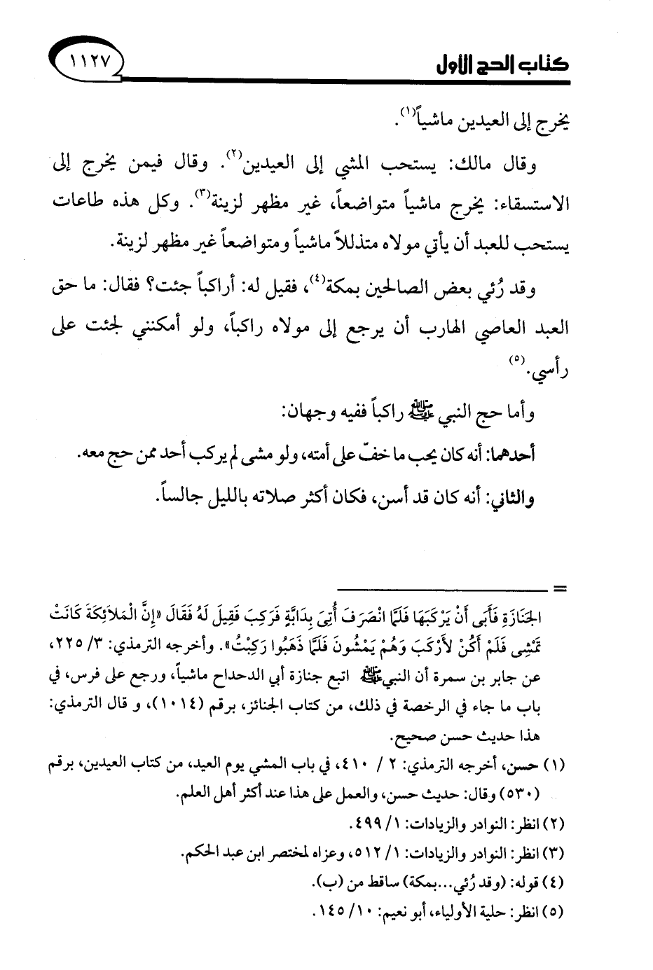 وقال مالك: يستحب المشي إلى العيدين (¬2). وقال فيمن يخرج إلى الاستسقاء: يخرج ماشيًا متواضعًا، غير مظهر لزينة (¬3). وكل هذه طاعات يستحب للعبد أن يأتي مولاه متذللًا ماشيًا ومتواضعًا غير مظهر لزينة.