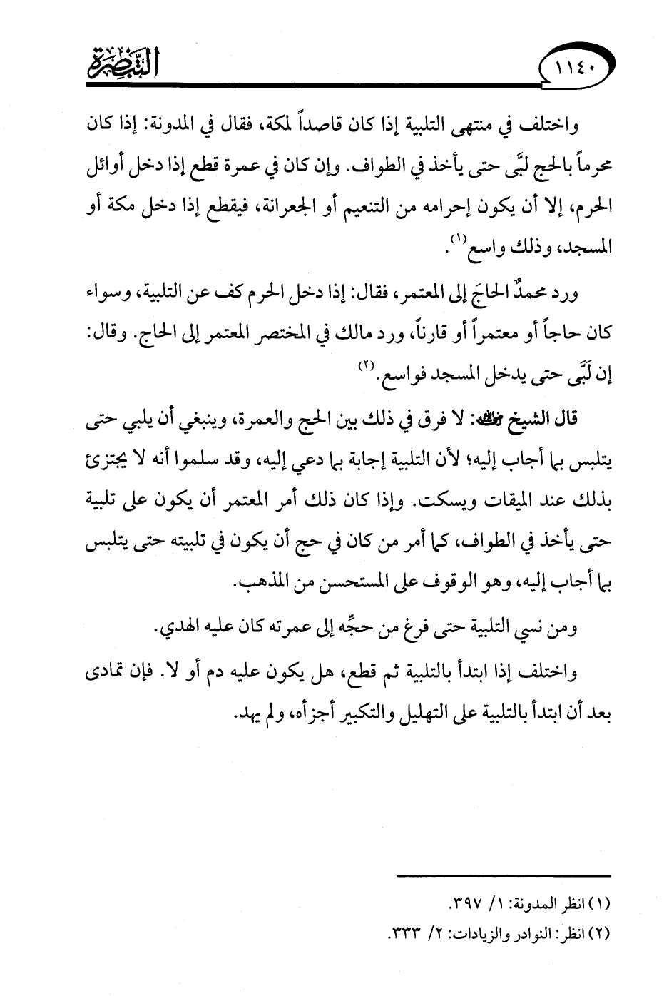 ورد محمدٌ الحاجَ إلى المعتمر، فقال: إذا دخل الحرم كف عن التلبية، وسواء كان حاجًا أو معتمرًا أو قارنًا، ورد مالك في المختصر المعتمر إلى الحاج. وقال: إن لَبَّى حتى يدخل المسجد فواسع. (¬2)