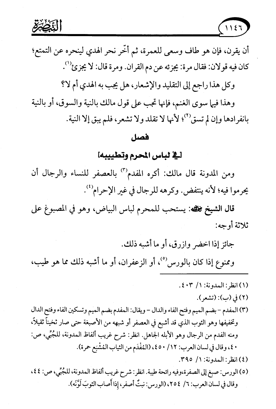(¬3) المفدم -بضم الميم وفتح الفاء والدال- ويقال: المفدم بضم الميم وتسكن الفاء وفتح الدال وتخفيفها وهو الثوب الذي قد أشبع في العصفر أو شبهه من الأصبغة حتى صار ثخينًا ثقيلًا، ومنه الفدم من الرجال وهو الأبله الجاهل. انظر: شرح غريب ألفاظ المدونة، للجُبِّي، ص: 40، وقال في لسان العرب: 12/ 450، (المُفْدَم من الثياب المُشْبَع حمرة).