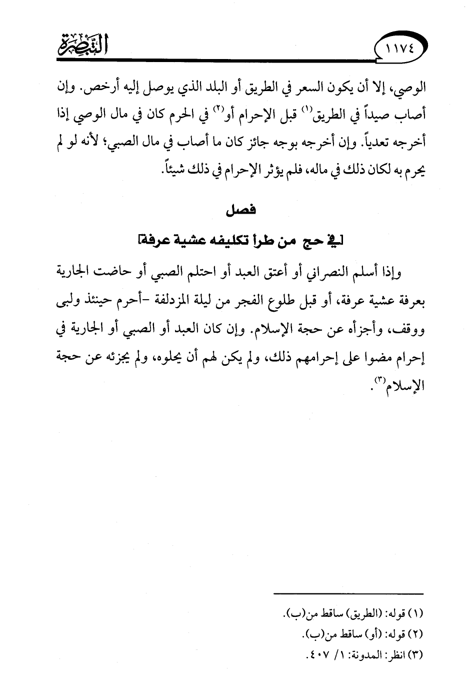 وإذا أسلم النصراني أو أعتق العبد أو احتلم الصبي أو حاضت الجارية بعرفة عشية عرفة، أو قبل طلوع الفجر من ليلة المزدلفة- أحرم حينئذ ولبى ووقف، وأجزأه عن حجة الإسلام. وإن كان العبد أو الصبي أو الجارية في إحرام مضوا على إحرامهم ذلك، ولم يكن لهم أن يحلوه، ولم يجزئه عن حجة الإسلام (¬3).