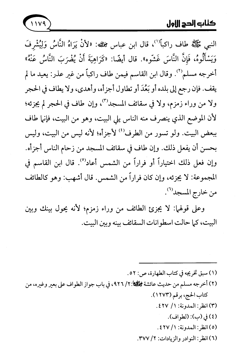 النبي - صلى الله عليه وسلم -طاف راكبًا (¬1)، قال ابن عباس- رضي الله عنه -: "لأنْ يَرَاهُ النَّاسُ وَلِيُشْرِفَ وَيَسْأَلُوهُ، فَإِنَّ النَّاسَ غَشّوه". قال أيضًا: "كَرَاهِيَةَ أَنْ يُضْرَبَ النَّاسُ عَنْهُ" أخرجه مسلم (¬2). وقال ابن القاسم فيمن طاف راكبًا من غير عذر: يعيد ما لم يقف. فإن رجع إلى بلده أو بَعُدَ أو تطاول أجزأه، وأهدى، ولا يطاف في الحجر ولا من وراء زمزم، ولا في سقائف المسجد (¬3)، وإن طاف في الحجر لم يجزئه؛ لأن الموضع الذي ينصرف منه الناس يلي البيت، وهو من البيت، فإنما طاف ببعض البيت. ولو تسور من الطرف (¬4) لأجزأه؛ لأنه ليس من البيت، وليس بحسن أن يفعل ذلك. وإن طاف في سقائف المسجد من زحام الناس أجزأه. وإن فعل ذلك اختيارًا أو فرارًا من الشمس أعاد (¬5). قال ابن القاسم في المجموعة: لا يجزئه، وإن كان فرارًا من الشمس. قال أشهب: وهو كالطائف من خارج المسجد (¬6).