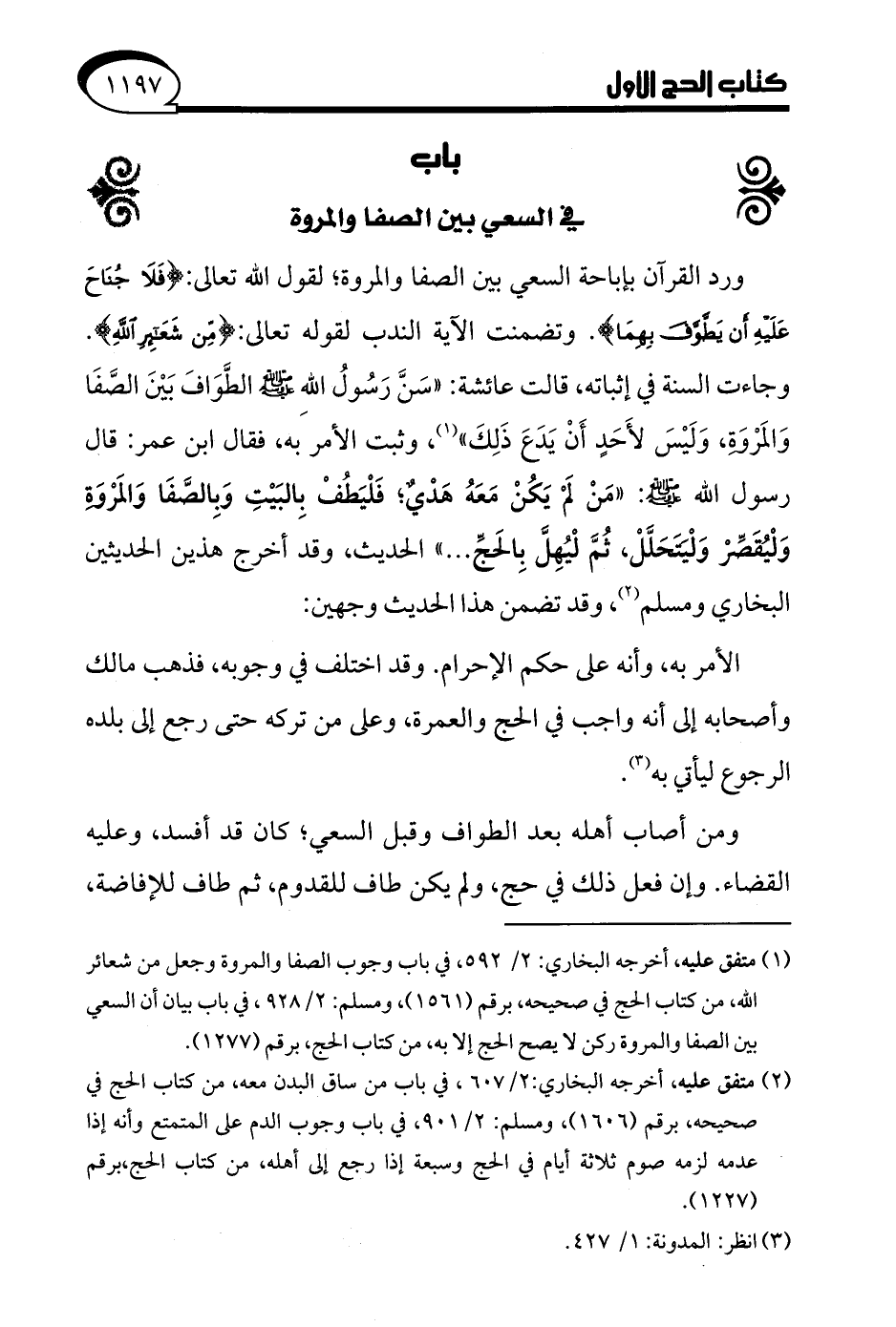 ورد القرآن بإباحة السعي بين الصفا والمروة؛ لقول الله تعالى: {فَلَا جُنَاحَ عَلَيْهِ أَنْ يَطَّوَّفَ بِهِمَا}. وتضمنمت الآية الندب لقوله تعالى: {مِنْ شَعَائِرِ اللَّهِ}. وجاءت السنة في إثباته، قالت عائشة: "سَنَّ رَسُولُ اللهِ - صلى الله عليه وسلم -الطَّوَافَ بَيْنَ الصَّفَا وَالمَرْوَةِ، وَلَيْسَ لأَحَدٍ أَنْ يَدَعَ ذَلِكَ" (¬1)، وثبت الأمر به، فقال ابن عمر: قال رسول الله - صلى الله عليه وسلم -: "مَنْ لَمْ يَكُنْ مَعَهُ هَدْيٌ؛ فَلْيَطُفْ بِالبَيْتِ وَبِالصَّفَا وَالمَرْوَةِ وَلْيُقَصِّرْ وَلْيَتَحَلَّلْ، ثُمَّ لْيُهِلَّ بِالحَجِّ. . ." الحديث، وقد أخرج هذين الحديثين البخاري ومسلم (¬2)، وقد تضمن هذا الحديث وجهين: