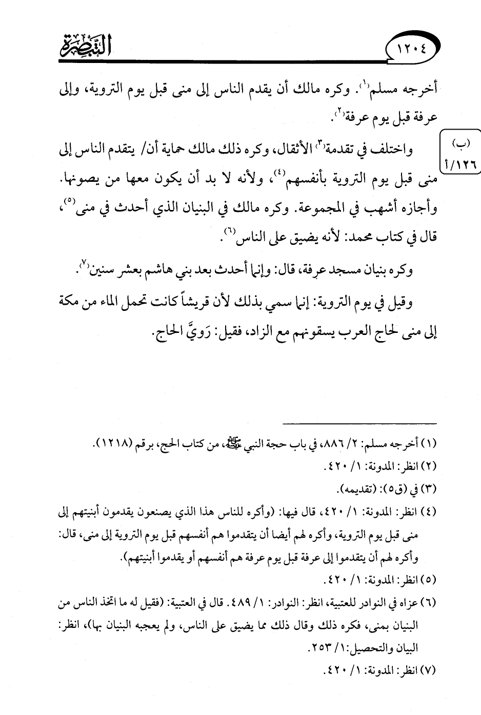 (¬4) انظر: المدونة: 1/ 420، قال فيها: (وأكره للناس هذا الذي يصنعون يقدمون أبنيتهم إلى منى قبل يوم التروية, وأكره لهم أيضا أن يتقدموا هم أنفسهم قبل يوم الزوية إلى منى، قال: وأكره لهم أن يتقدموا إلى عرفة قبل يوم عرفة هم أنفسهم أو يقدموا أبنيتهم).