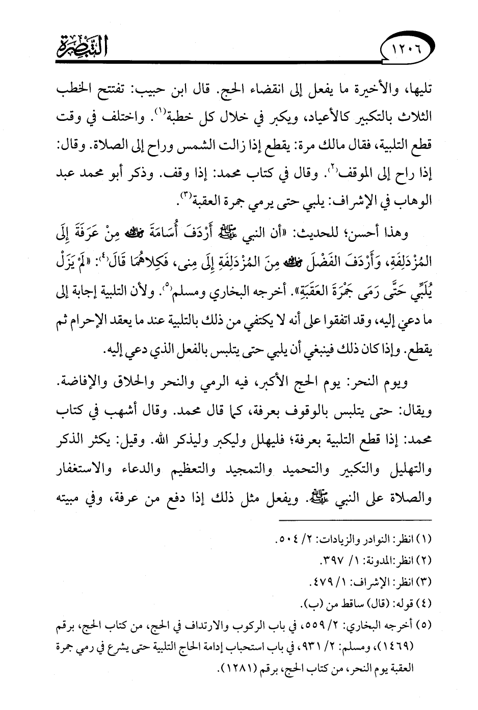 (¬5) أخرجه البخاري: 2/ 559، في باب الركوب والارتداف في الحج، من كتاب الحج، برقم (1469)، ومسلم: 2/ 931، في باب استحباب إدامة الحاج التلبية حتى يشرع في رمي جمرة العقبة يوم النحر، من كتاب الحج، برقم (1281).
