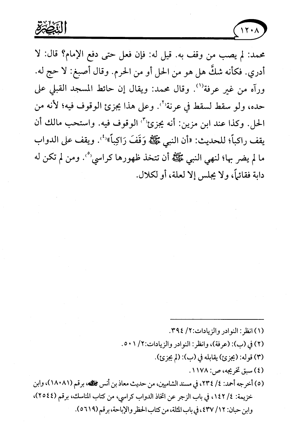 محمد: لم يصب من وقف به. قيل له: فإن فعل حتى دفع الإمام؟ قال: لا أدري. فكأنه شكَّ هل هو من الحل أو من الحرم. وقال أصبغ: لا حج له. ورآه من غير عرفة (¬1). وقال محمد: ويقال إن حائط المسجد القبلي على حده، ولو سقط لسقط في عرنة (¬2). وعلى هذا يجزئ الوقوف فيه؛ لأنه من الحل. وكذا عند ابن مزين: أنه يجزئ (¬3) الوقوف فيه. واستحب مالك أن يقف راكبًا؛ للحديث: "أن النبي - صلى الله عليه وسلم - وَقَفَ رَاكِبًا" (¬4). ويقف على الدواب ما لم يضر بها؛ لنهي النبي - صلى الله عليه وسلم - أن تتخذ ظهورها كراسي (¬5). ومن لم تكن له دابة فقائمًا، ولا يجلس إلا لعلة، أو لكلال.