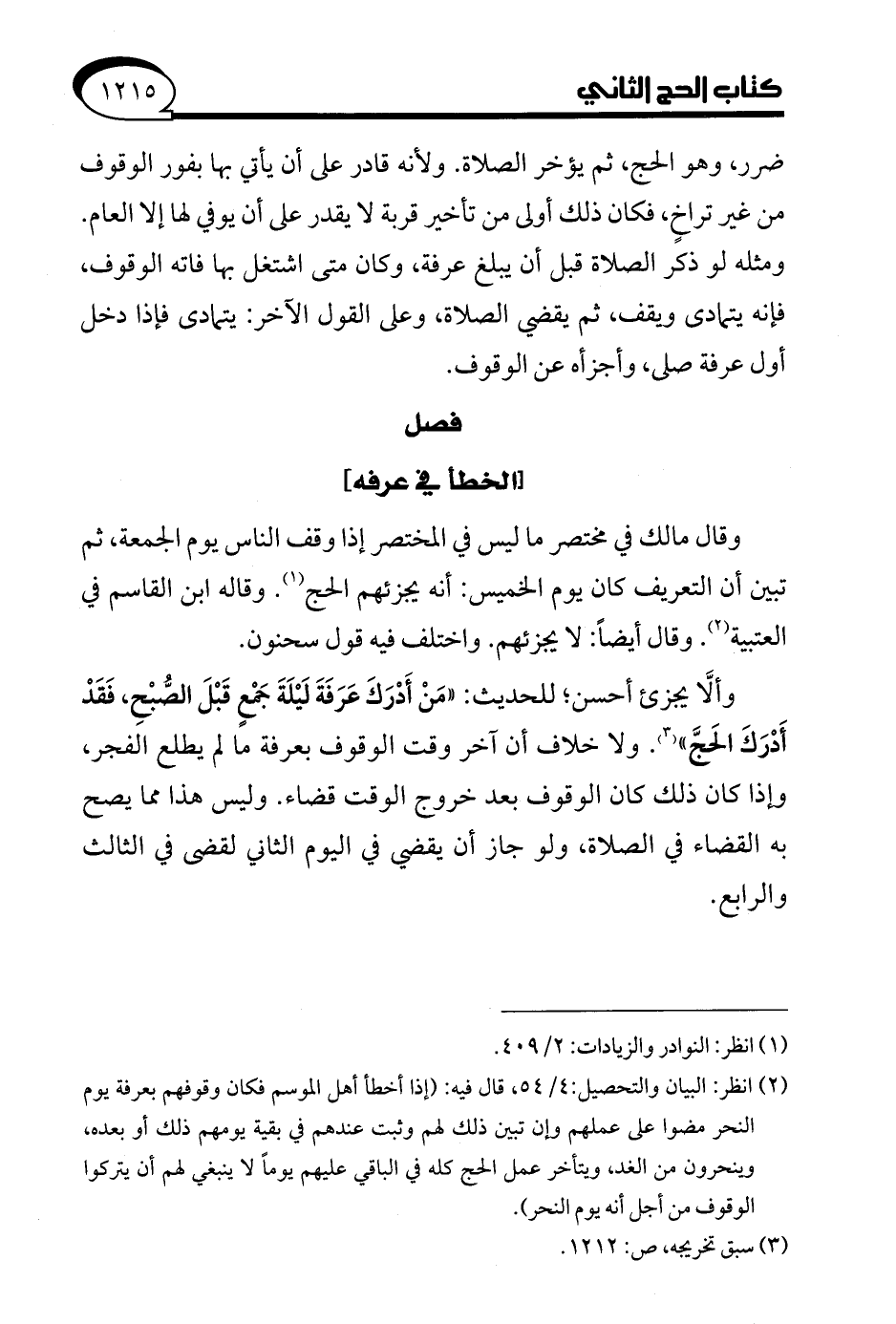 (¬2) انظر: البيان والتحصيل: 4/ 54، قال فيه: (إذا أخطأ أهل الموسم فكان وقوفهم بعرفة يوم النحر مضوا على عملهم وإن تبين ذلك لهم وثبت عندهم في بقية يومهم ذلك أو بعده, وينحرون من الغد، ويتأخر عمل الحج كله في الباقي عليهم يومًا لا ينبغي لهم أن يتركوا الوقوف من أجل أنه يوم النحر).