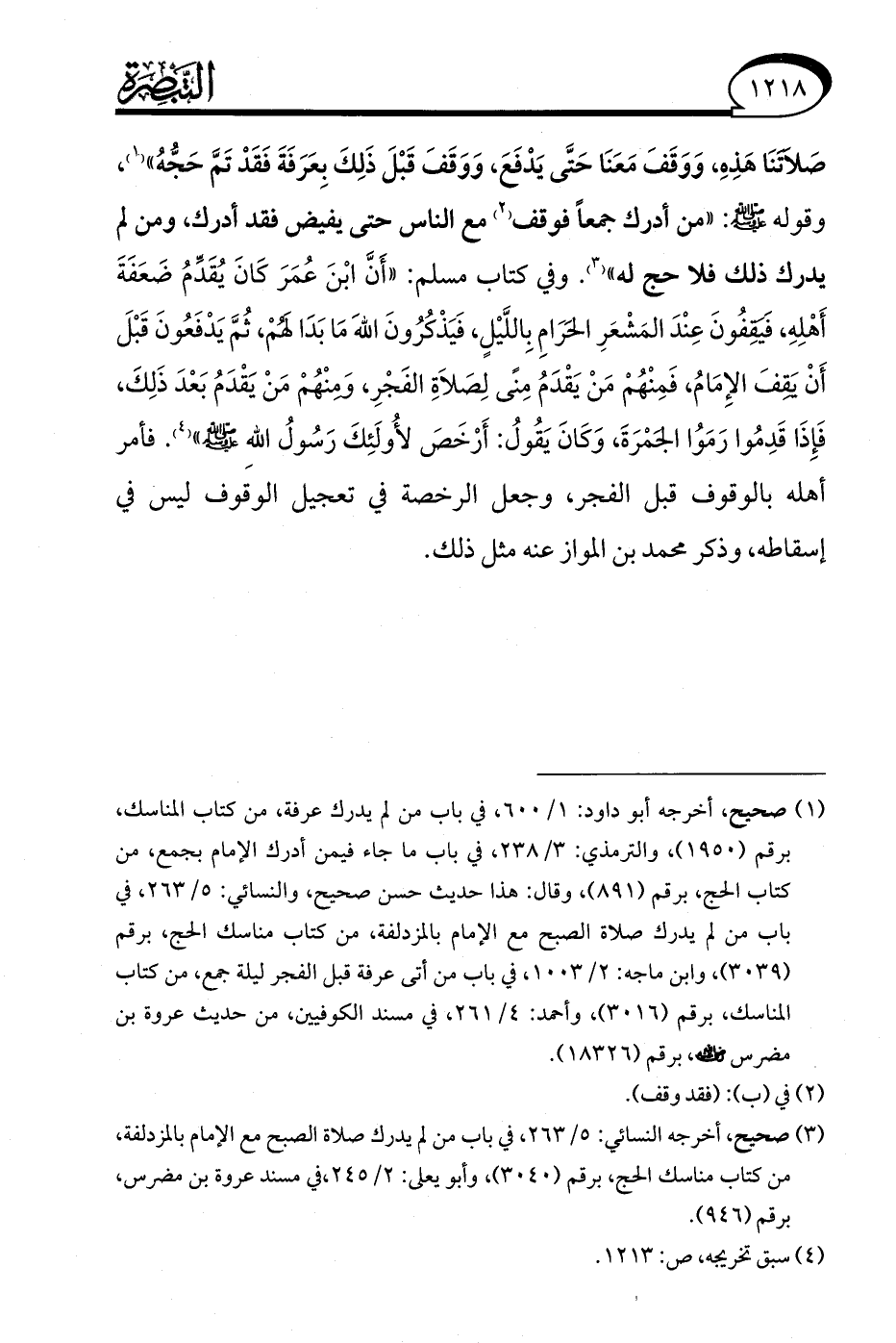 (¬1) صحيح، أخرجه أبو داود: 1/ 600، في باب من لم يدرك عرفة, من كتاب المناسك، برقم (1950)، والترمذي: 3/ 238، في باب ما جاء فيمن أدرك الإمام بجمع، من كتاب الحج، برقم (891)، وقال: هذا حديث حسن صحيح، والنسائي: 5/ 263، في باب من لم يدرك صلاة الصبح مع الإمام بالمزدلفة، من كتاب مناسك الحج، برقم (3039)، وابن ماجه: 2/ 1003، في باب من أتى عرفة قبل الفجر ليلة جمع، من كتاب المناسك، برقم (3016)، وأحمد: 4/ 261، في مسند الكوفيين، من حديث عروة بن مضرس - رضي الله عنه -، برقم (18326).