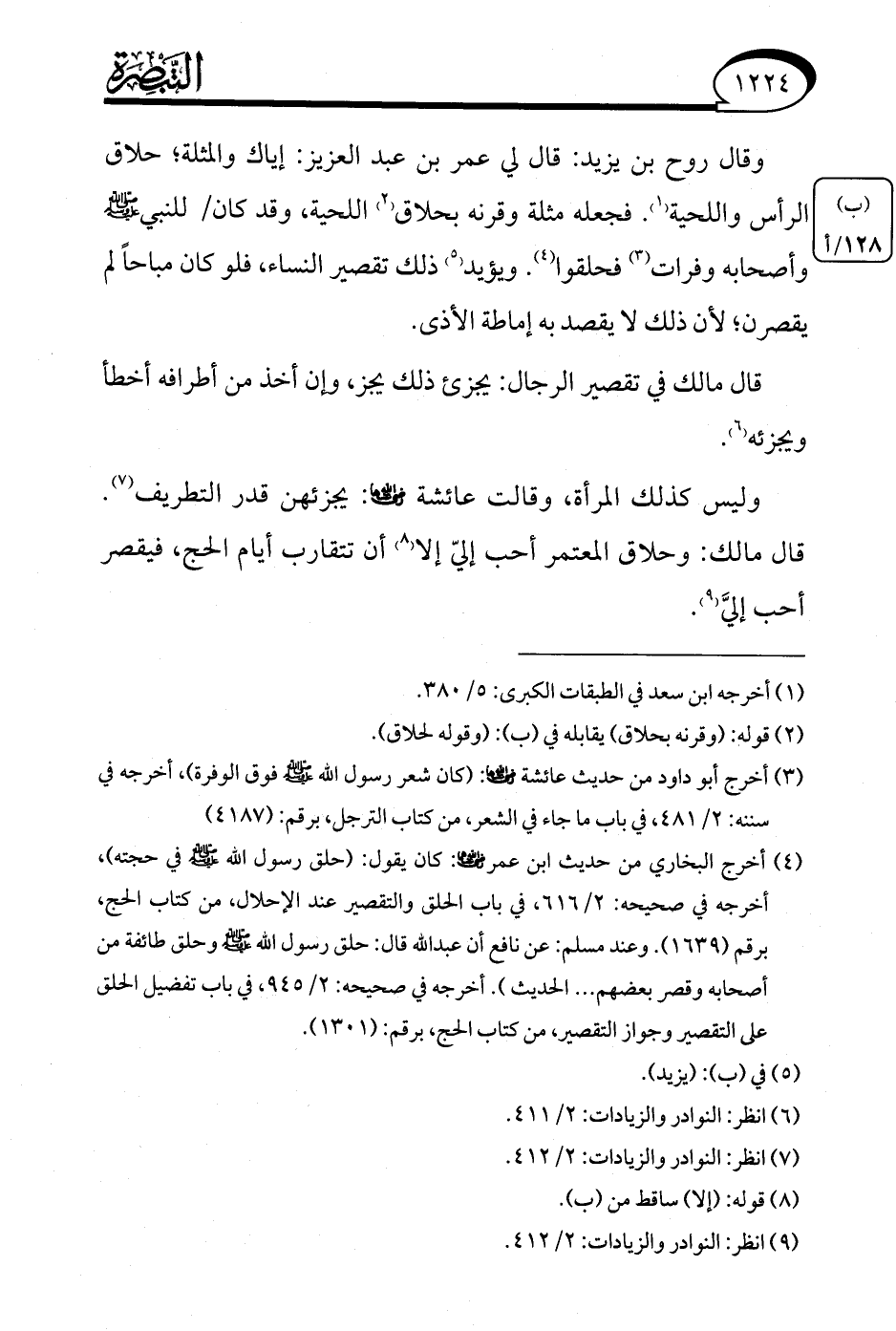 وقال روح بن يزيد: قال لي عمر بن عبد العزيز: إياك والمثلة؛ حلاق الرأس واللحية (¬1). فجعله مثلة وقرنه بحلاق (¬2) اللحية, وقد كان للنبي - صلى الله عليه وسلم - وأصحابه وفرات (¬3) فحلقوا (¬4). ويؤيد (¬5) ذلك تقصير النساء، فلو كان مباحًا لم يقصرن؛ لأن ذلك لا يقصد به إماطة الأذى.