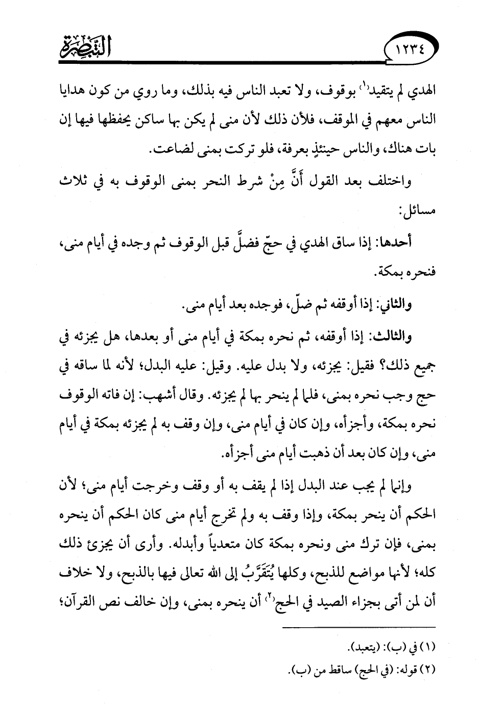 واختلف بعد القول أَنَّ مِنْ شرط النحر بمنى الوقوف به في ثلاث مسائل: