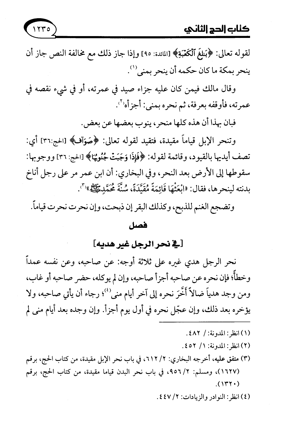(¬3) متفق عليه, أخرجه البخاري: 2/ 612، في باب نحر الإبل مقيدة، من كتاب الحج، برقم (1627)، ومسلم: 2/ 956، في باب نحر البدن قياما مقيدة، من كتاب الحج، برقم (1320).