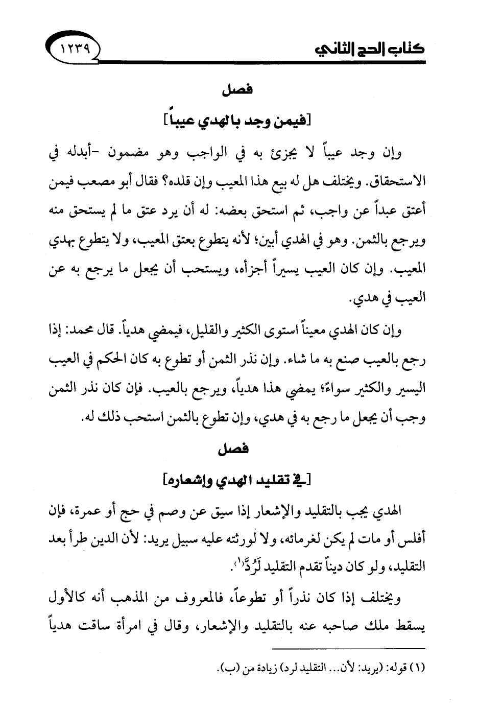 الهدي يجب بالتقليد والإشعار إذا سيق عن وصم في حج أو عمرة، فإن أفلس أو مات لم يكن لغرمائه، ولا لورثته عليه سبيل يريد: لأن الدين طرأ بعد التقليد، ولو كان دينًا تقدم التقليد لَرُدَّ (¬1).