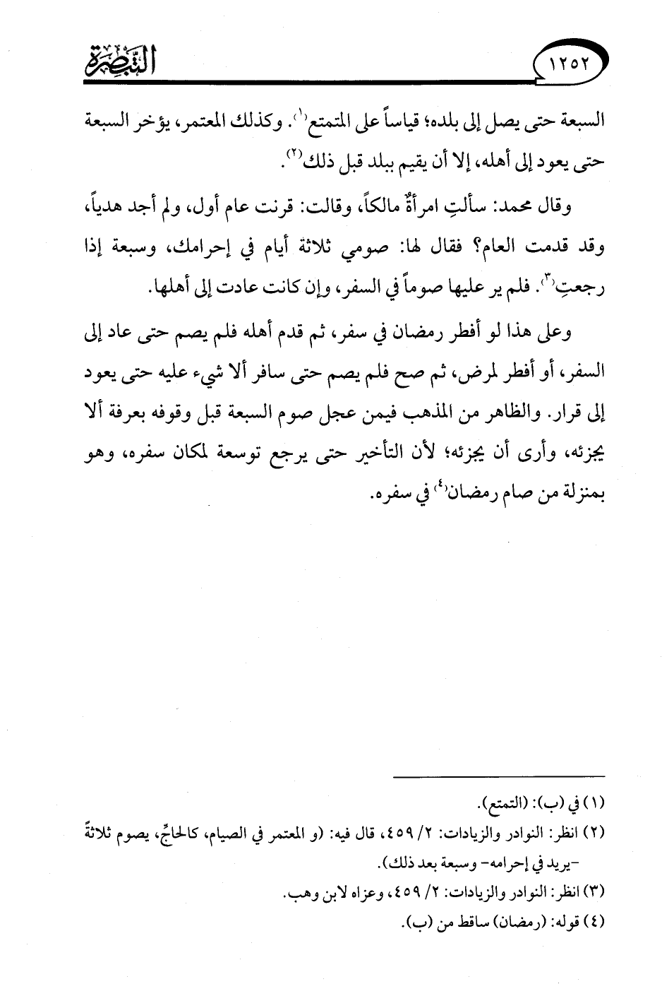 (¬2) انظر: النوادر والزيادات: 2/ 459، قال فيه: (والمعتمر في الصيام، كالحاجِّ، يصوم ثلاثةً -يريد في إحرامه- وسبعة بعد ذلك).