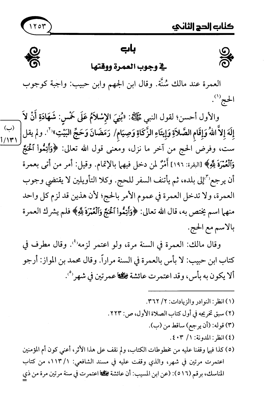 والأول أحسن؛ لقول النبي - صلى الله عليه وسلم -: "بُنِيَ الإِسْلاَمُ عَلَى خَمْسٍ: شَهَادَةِ أَنْ لاَ إِلَهَ إِلاَّ اللهُ وَإِقَامِ الصَّلاَةِ وَإِيتَاءِ الزَّكَاةِ وَصِيَامِ رَمَضَانَ وَحَجِّ البَيْتِ" (¬2). ولم يقل، ست، وفرض الحج من آخر ما نزل، ومعنى قول الله تعالى: {وَأَتِمُّوا الْحَجَّ وَالْعُمْرَةَ لِلَّهِ} [البقرة: 196] أَمْرٌ لمن دخل فيهما بالإتمام. وقيل: أمر من أتى بعمرة أن يرجع (¬3) إلى بلده، ثم يأتنف السفر للحج. وكلا التأويلين لا يقتضي وجوب العمرة، ولا تدخل العمرة في عموم الأمر بالحج؛ لأن هذين قد لزم كل واحد منهما اسم يختص به، قال الله تعالى: {وَأَتِمُّوا الْحَجَّ وَالْعُمْرَةَ لِلَّهِ} فلم يشرك العمرة بالاسم مع الحج.