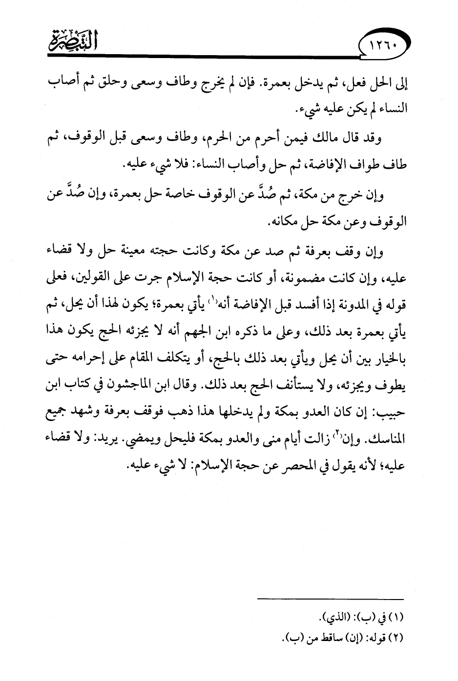 وإن وقف بعرفة ثم صد عن مكة وكانت حجته معينة حل ولا قضاء عليه، وإن كانت مضمونة، أو كانت حجة الإسلام جرت على القولين، فعلى قوله في المدونة إذا أفسد قبل الإفاضة أنه (¬1) يأتي بعمرة؛ يكون لهذا أن يحل، ثم يأتي بعمرة بعد ذلك، وعلى ما ذكره ابن الجهم أنه لا يجزئه الحج يكون هذا بالخيار بين أن يحل ويأتي بعد ذلك بالحج، أو يتكلف المقام على إحرامه حتى يطوف ويجزئه، ولا يستأنف الحج بعد ذلك. وقال ابن الماجشون في كتاب ابن حبيب: إن كان العدو بمكة ولم يدخلها هذا ذهب فوقف بعرفة وشهد جميع المناسك. وإن (¬2) زالت أيام منى والعدو بمكة فليحل ويمضي. يريد: ولا قضاء عليه؛ لأنه يقول في المحصر عن حجة الإسلام: لا شيء عليه.