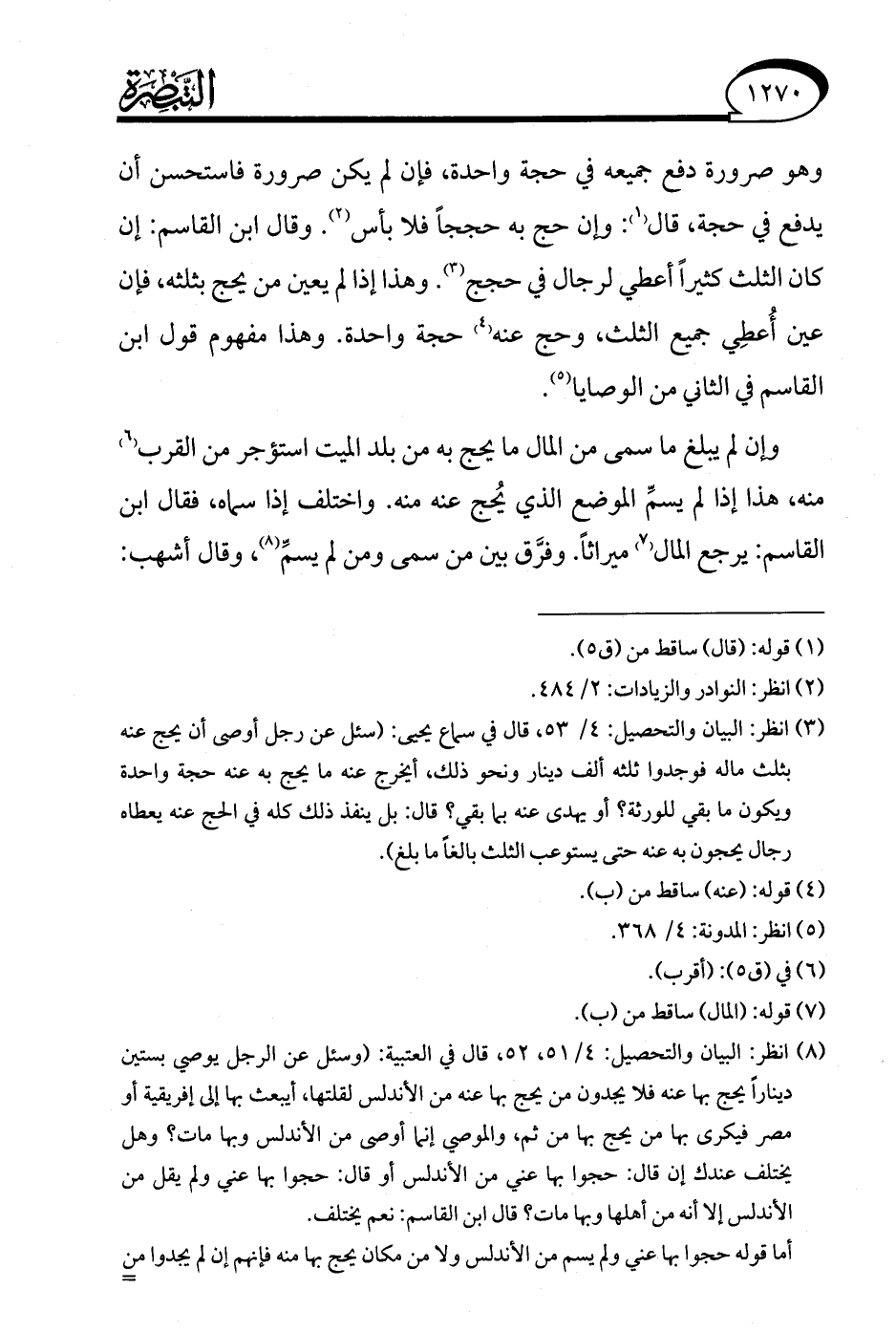 (¬8) انظر: البيان والتحصيل: 4/ 51، 52، قال في العتبية: (وسئل عن الرجل يوصي بستين دينارًا يحج بها عنه فلا يجدون من يحج بها عنه من الأندلس لقلتها، أيبعث بها إلى إفريقية أو مصر فيكرى بها من يحج بها من ثم، والموصي إنما أوصى من الأندلس وبها مات؟ وهل يختلف عندك إن قال: حجوا بها عني من الأندلس أو قال: حجوا بها عني ولم يقل من الأندلس إلا أنه من أهلها وبها مات؟ قال ابن القاسم: نعم يختلف.