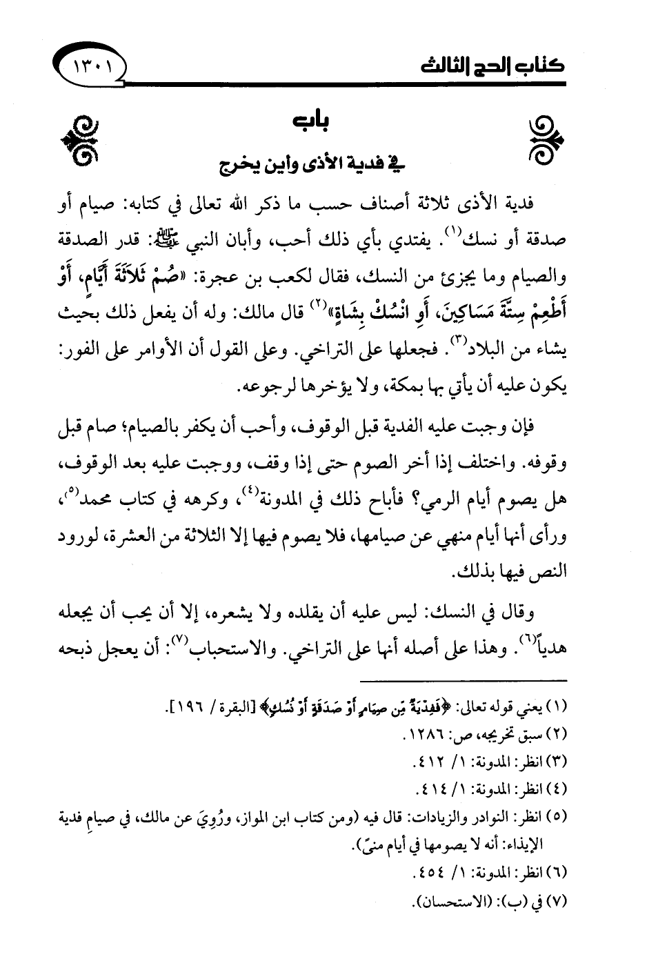 (¬5) انظر: النوادر والزيادات: قال فيه (ومن كتاب ابن المواز، ورُوِيَ عن مالك، في صيامِ فدية الإيذاء: أنه لا يصومها في اْيام منىً).