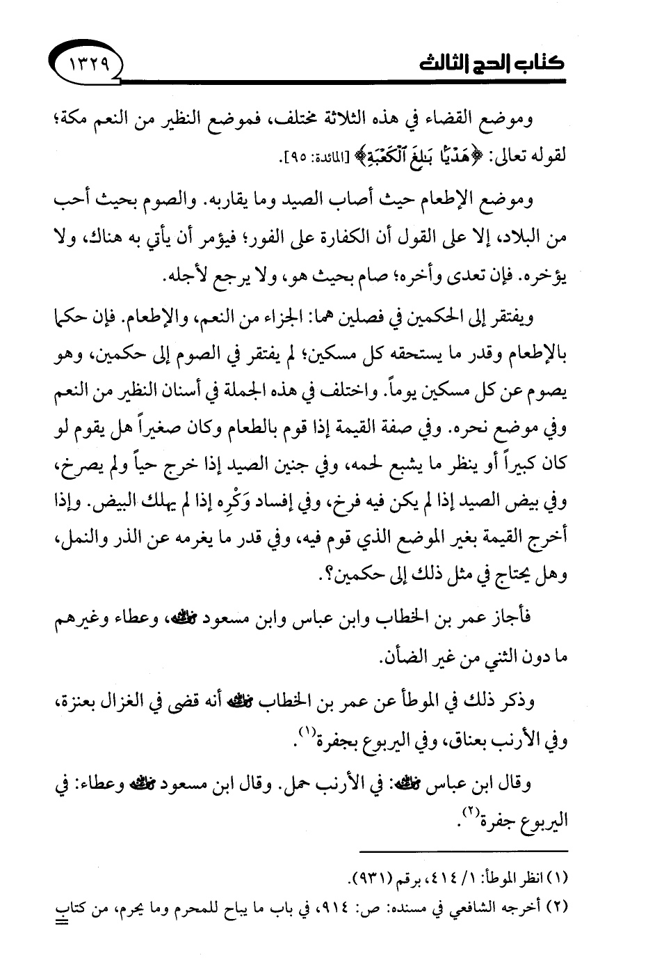 ويفتقر إلى الحكمين في فصلين هما: الجزاء من النعم، والإطعام. فإن حكما بالإطعام وقدر ما يستحقه كل مسكين؛ لم يفتقر في الصوم إلى حكمين، وهو يصوم عن كل مسكين يومًا. واختلف في هذه الجملة في أسنان النظير من النعم وفي موضع نحره. وفي صفة القيمة إذا قوم بالطعام وكان صغيرًا هل يقوم لو كان كبيرًا أو ينظر ما يشبع لحمه، وفي جنين الصيد إذا خرج حيًا ولم يصرخ، وفي بيض الصيد إذا لم يكن فيه فرخ، وفي إفساد وَكْرِه إذا لم يهلك البيض. وإذا أخرج القيمة بغير الموضع الذي قوم فيه، وفي قدر ما يغرمه عن الذر والنمل، وهل يحتاج في مثل ذلك إلى حكمين؟.