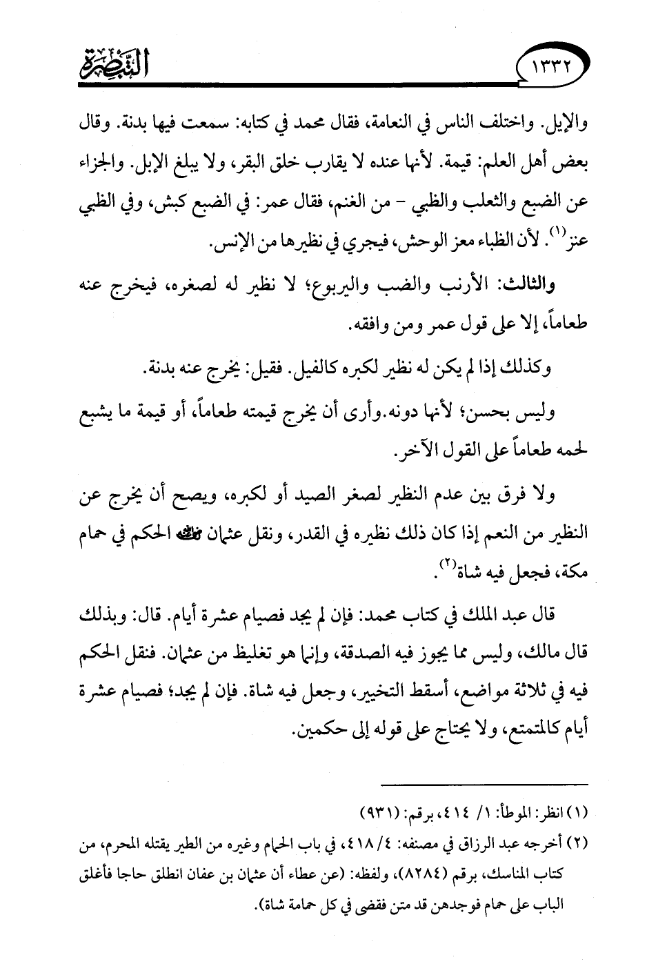 ولا فرق بين عدم النظير لصغر الصيد أو لكبره، ويصح أن يخرج عن النظير من النعم إذا كان ذلك نظيره في القدر، ونقل عثمان - رضي الله عنه - الحكم في حمام مكة، فجعل فيه شاة (¬2).