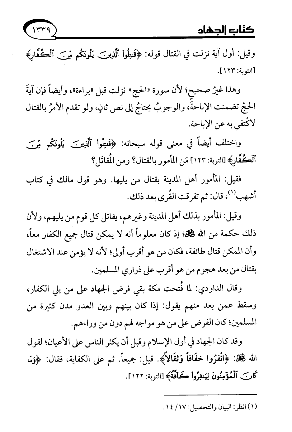 وهذا غيرُ صحيحٍ؛ لأن سورة "الحج" نزلت قبل "براءة"، وأيضًا فإن آيةَ الحجّ تضمنت الإباحةَ، والوجوبُ يحتاجُ إلى نص ثانٍ، ولو تقدم الأمرُ بالقتال لاكْتفي به عن الإباحة.